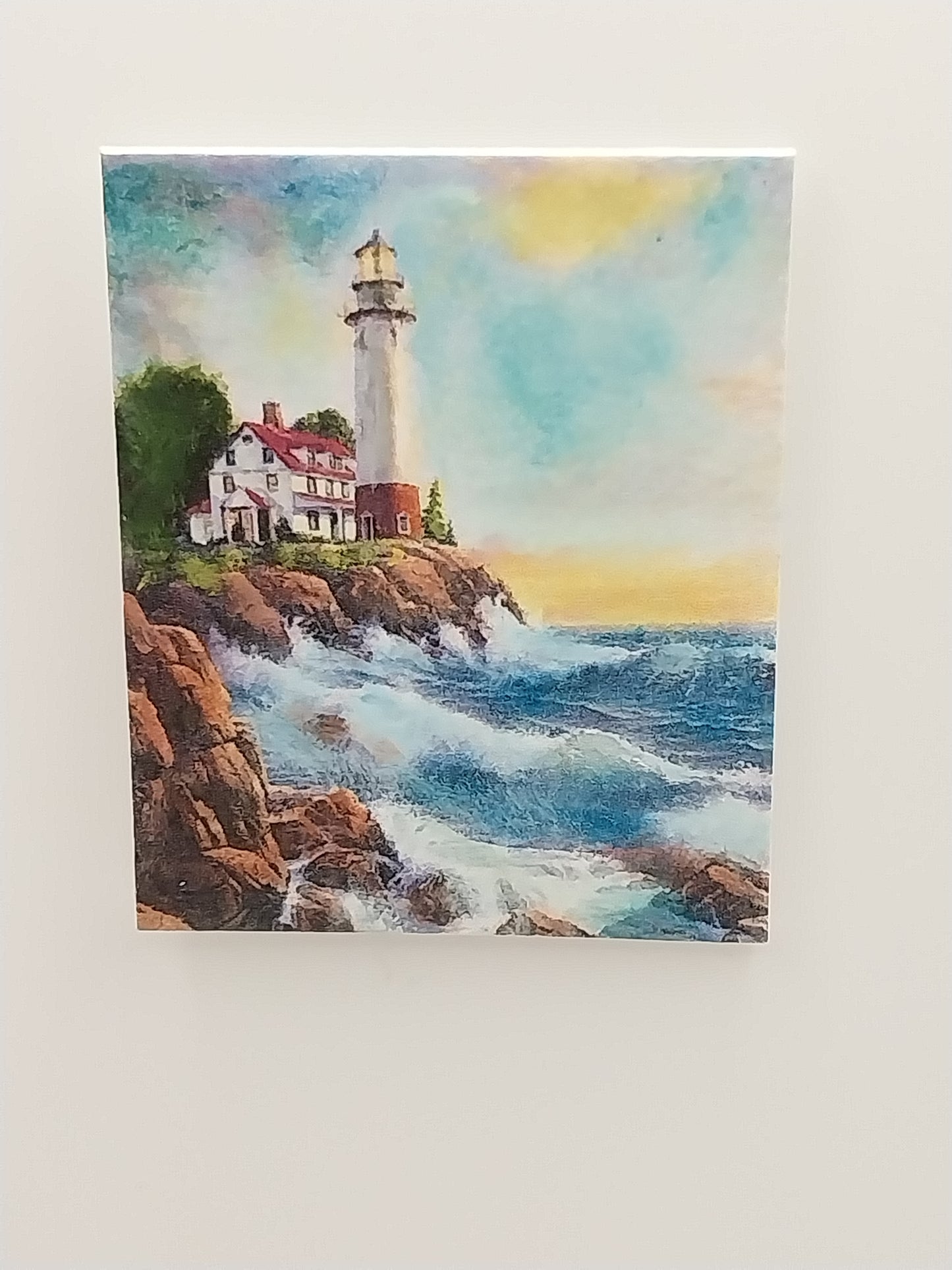 Oil Painting of a Lighthouse with the Ocean waves crashing below. Hand Painted by Artisan Larry Morganti, piece is signed by Artisan.