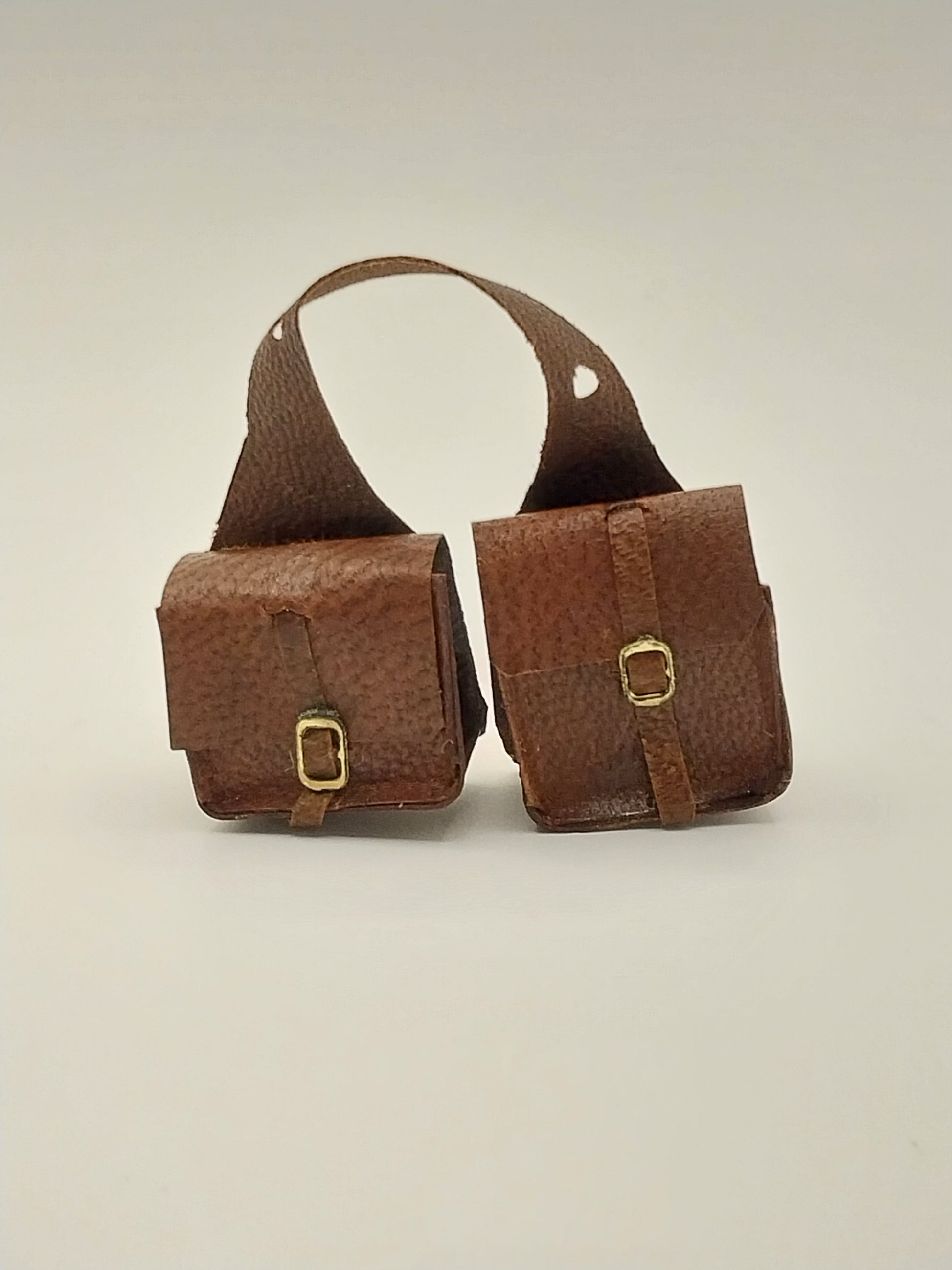 Old Leather Saddle Bag, Handmade by Prestige Leather. Shirley and George Petersen have been handcrafting miniatures for over 20 years. They have created their own patterns and use thin leather or suede, which they dye themselves and cut by hand, to create perfectly scaled items.