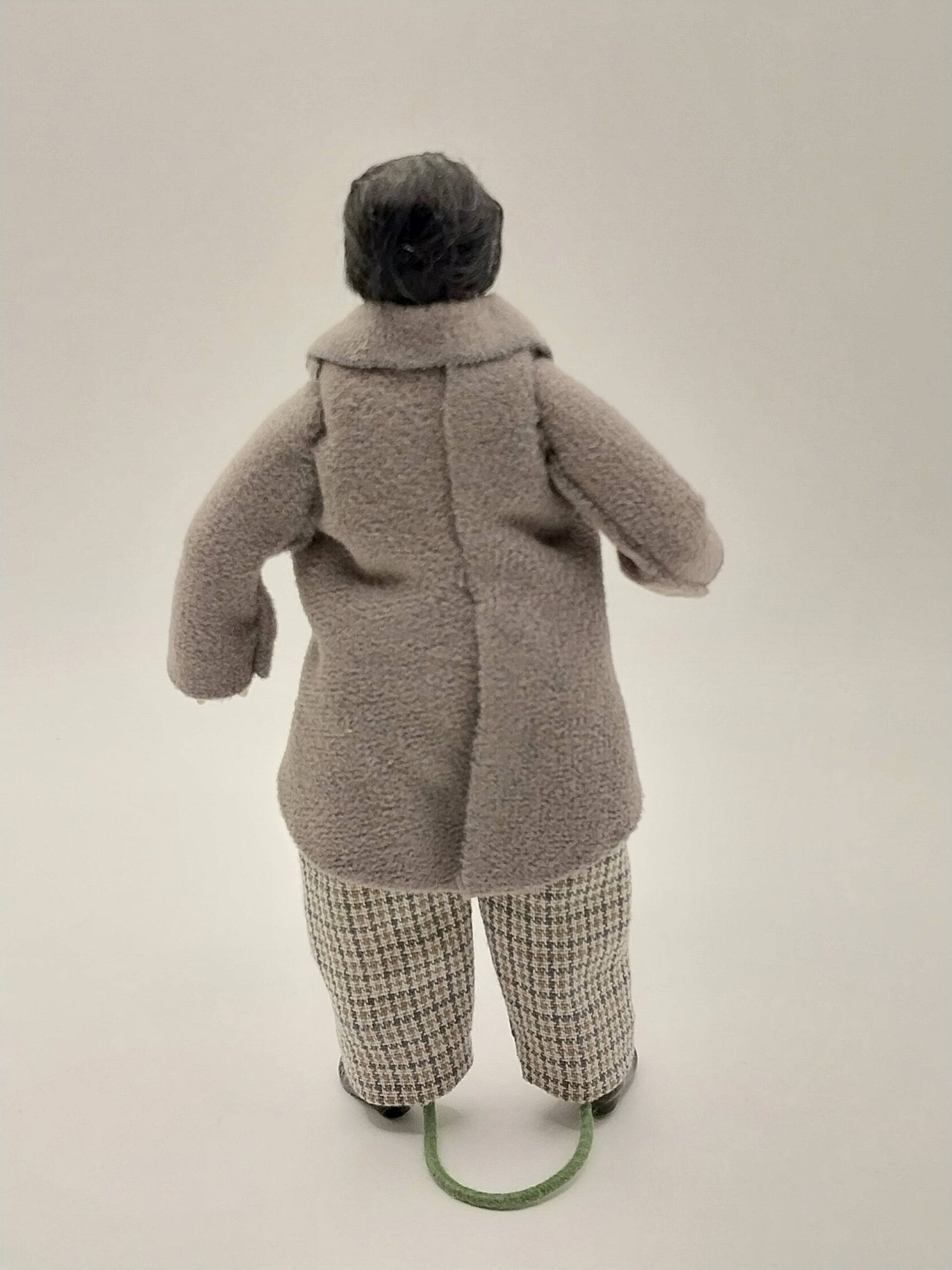 This Older Man Doll is made of Porcelain. Heavy set older man doll wearing tan and black plaid pants with white dress shirt and matching plaid vest with black bow tie. He has a grey jacket, with black hair and black crowbar mustache.