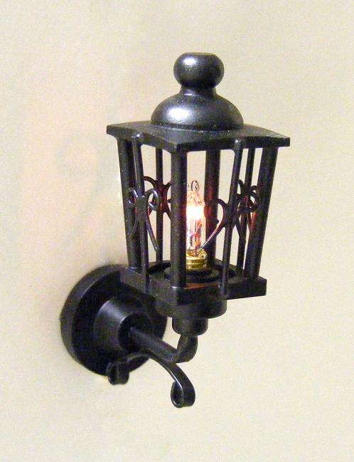 Ornate coach lamp includes a replaceable candle flame bulb, and works with a 12 Volt Electrical System. Flat black finish.