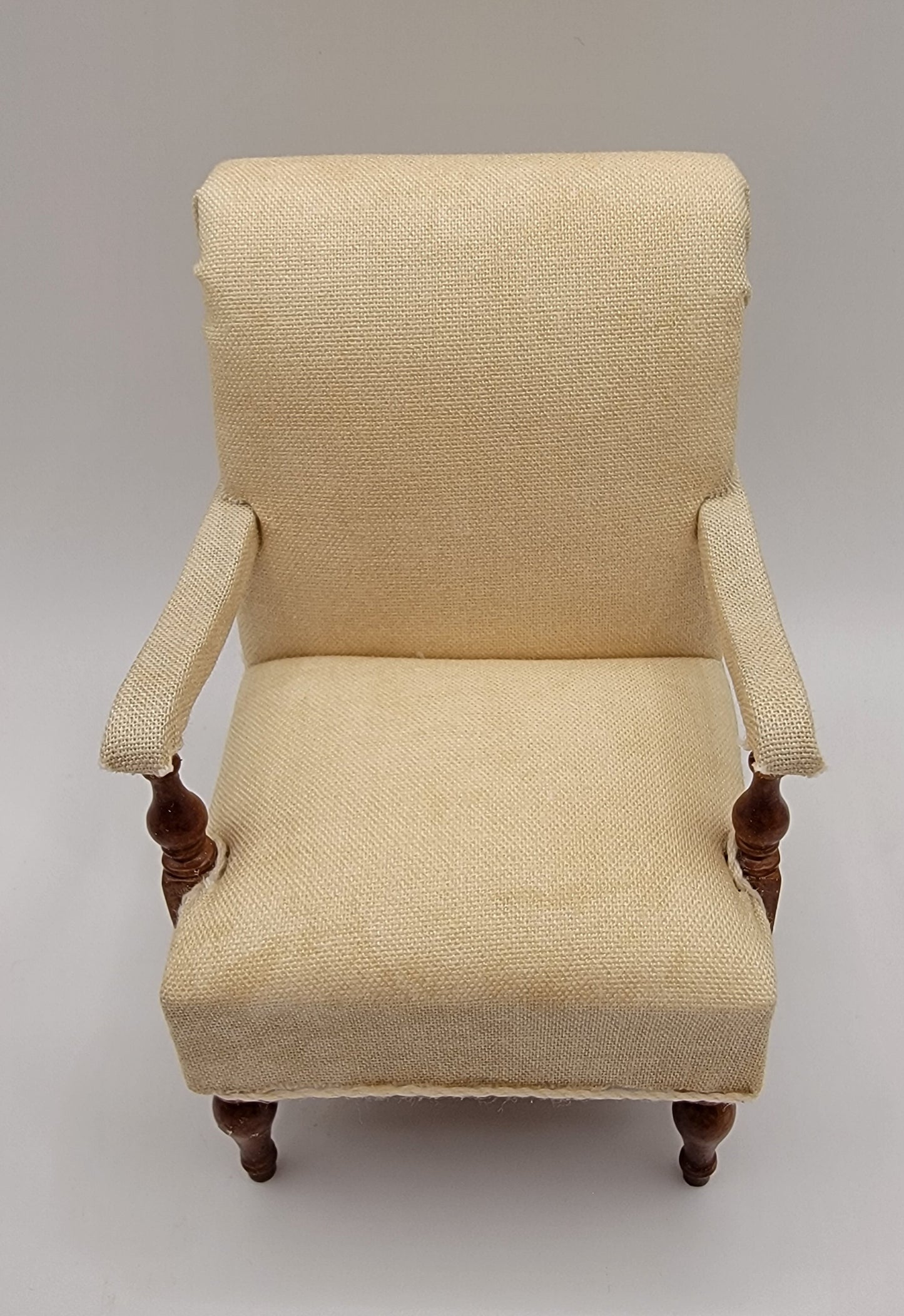 The Oxford Easy Chair has a high Back and long seat that projects beyond the open arms which are fully padded. The back is padded with a roll top. The chair has bobbin front legs and the straight back legs are splayed back. The chair is available in a walnut finish upholstered in a creamy yellow cotton fabric.