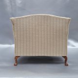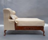 This Park Avenue Wing Back Bed is made by Bespaq and comes in a New Walnut finish. Bed has cream stripe fabric with 2 matching pillows with white lace. Bed has detailed carved embossed wood around frame of bed and legs.