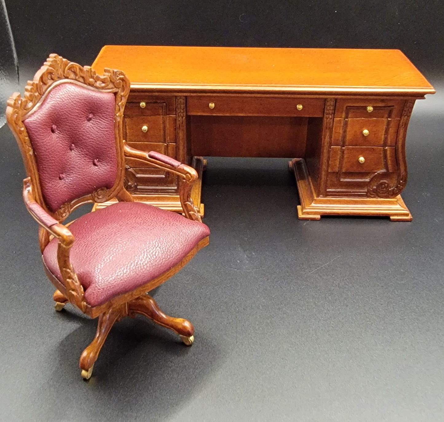 The Desk has a Rectangular top with a bull nose edge joining the 2 pedestals there are 3 drawers with brass knobs in each pedestal and one long drawer with 2 brass nobs joining the the pedestals. The front of the desk is closed in by an ornately carved pane. The sides of the pedestals are concave. The office chair has been designed in an Art Nouveau style the back of the chair has been decorated with traditional pieced cresting and a small caster is attached to the bottom of each of the curved legs that form the base of a chair.