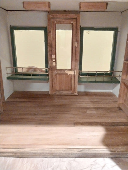 This Pet Shop was created by Artisan Fred Cobbs. Shop has double front glass shop windows and wooden door with glass pane. Front has faux stone work sidewalk. Shop has faux brick and concrete siding. Back of shop opens for easy access to interior. Wall to wall shelving on back of door that opens to interior. Inside is wood plank flooring and handmade shelving on either side of shop as well as wall of peg hooks to display accessories for the shop. Shop is electrified with 4 sets of LED strip lighting on the ceiling. Comes with transformer and lead in wire. Small strip of grass and fire hydrant on outside. This Shop is ready for you to add all the fury friends and accessories to make it your own little Pet shop. Piece is signed by Artisan.