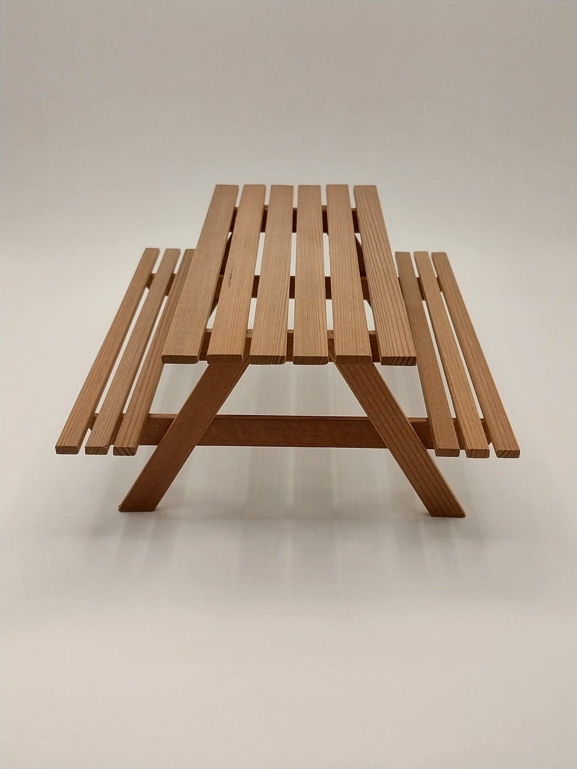 This Picnic Table is handmade by Artisan Wayne Crosby. Table is made of Cedar with attached benches. Piece is signed and dated by Artisan.