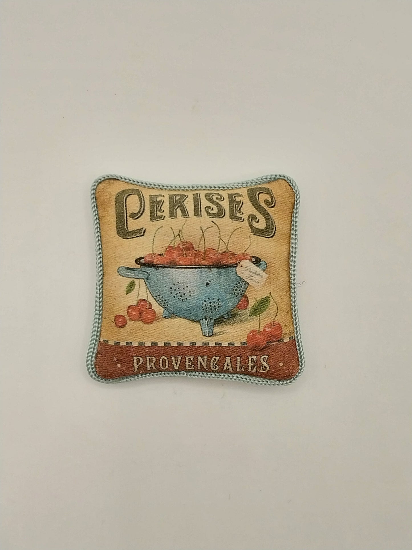 French Pillow with a colander of Fresh Cherries, pillow is trimmed in light blue cording