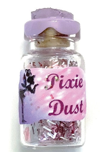 Size: 1/2" diameter x 1 1/8" high. Glass jar filled with pink glittery Pixie dust and capped with a cork dipped in lavendar wax. it is ideal for any fairy or wizard setting. One jar is filled with pink glittery Pixie dust and capped with a cork dipped in lavendar wax.