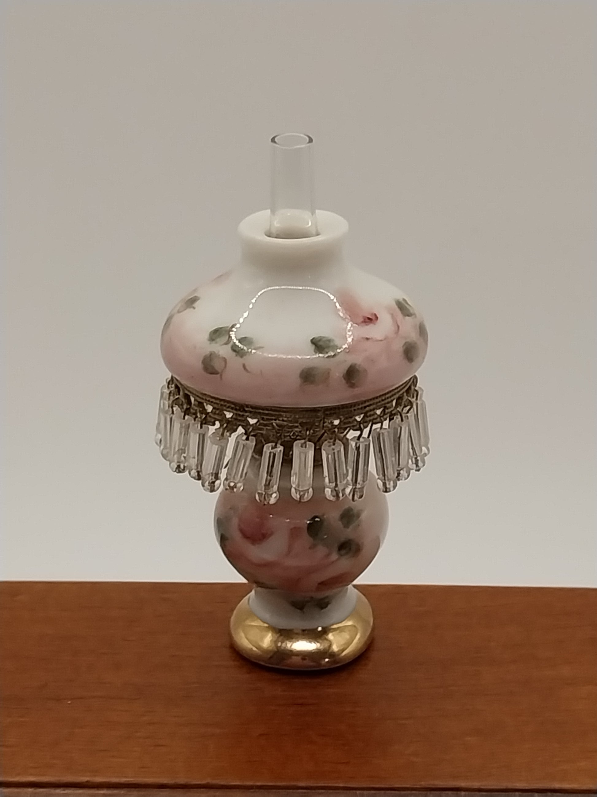 This Porcelain Hurricane Lamp is hand painted by Artisan Nicole Minnick of Ni-Glo Miniatures. Lamp has Pink English Rose design on base and shade of lamp, with gold trim on base of lamp. Lamp shade has hanging crystals, and works with a 12 Volt Electrical System