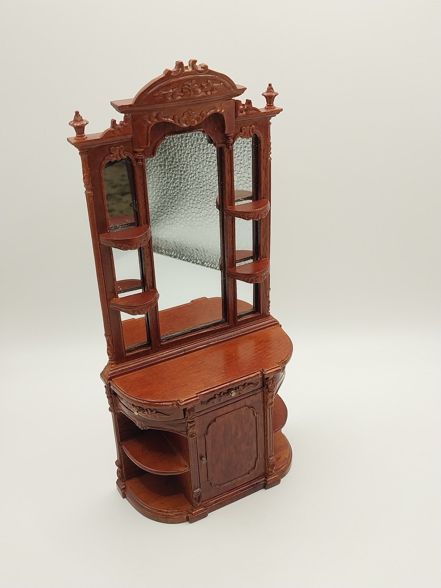 This Portia Collector's Case is made by Bespaq and comes in a New Walnut finish. Case has upper mirror with 4 small shelves, 3 lower drawers with intricate embossed carved wood and lower cabinet and 4 lower shelves.