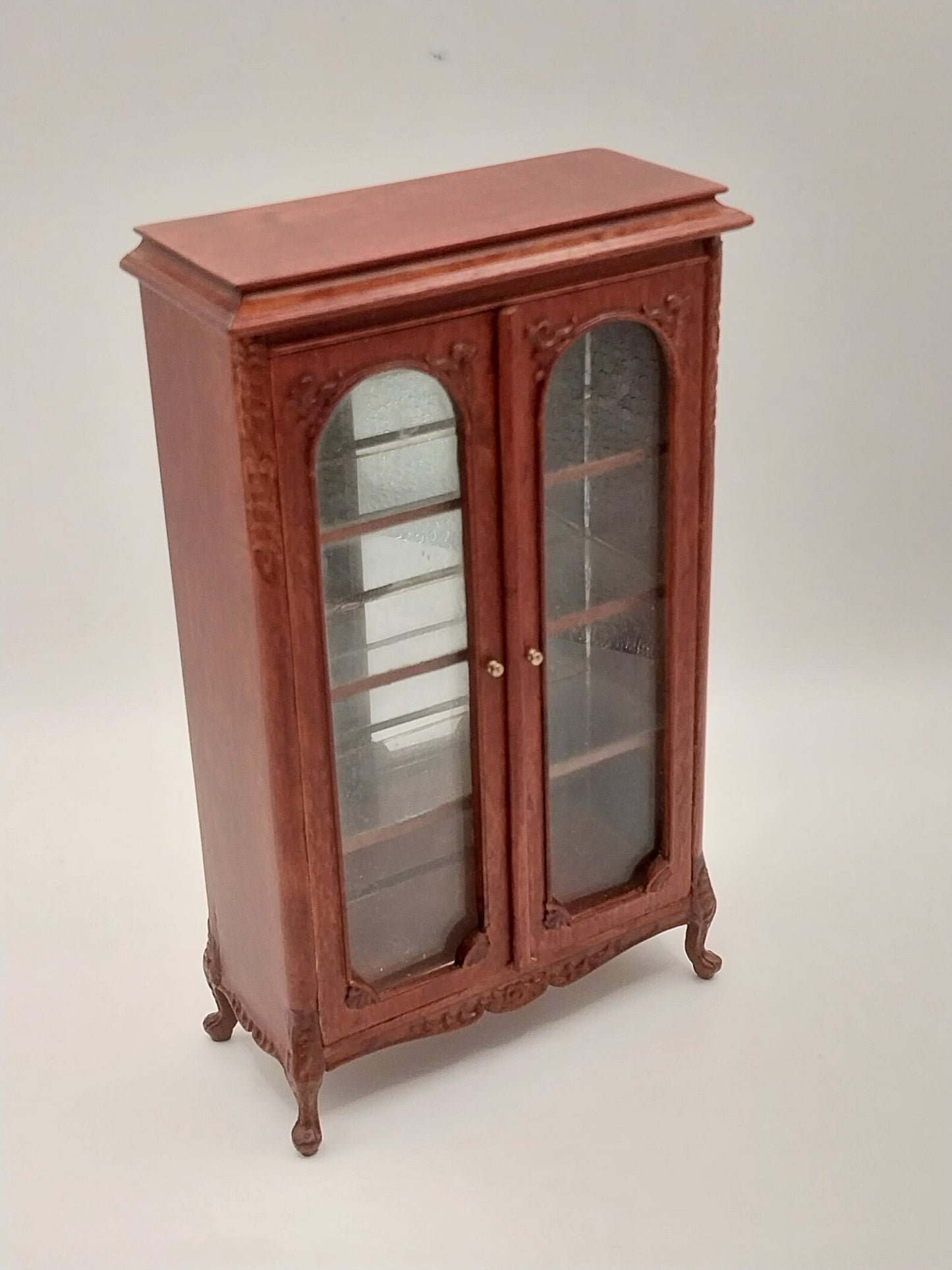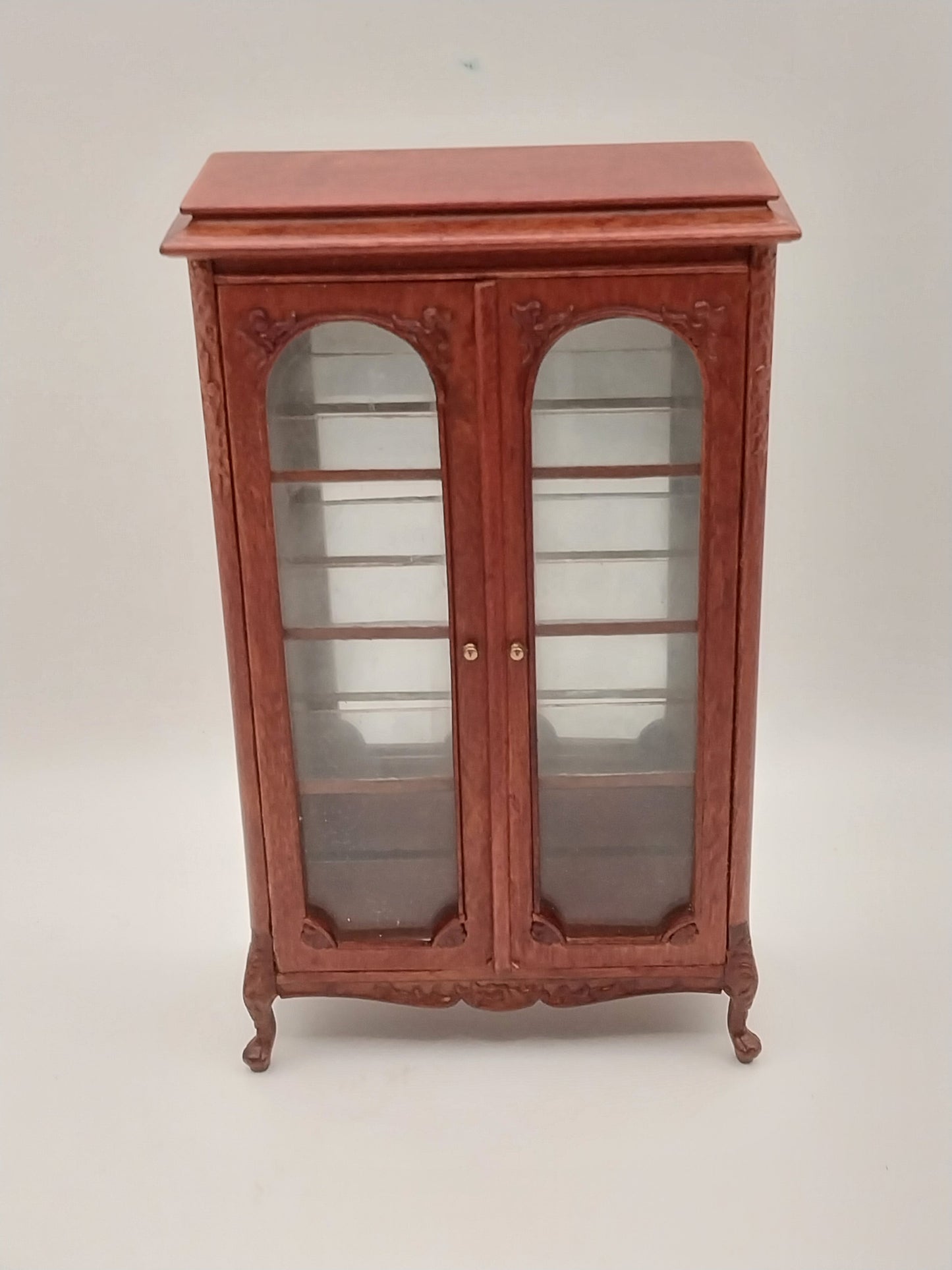 This Portsmouth Award Cabinet is made by Bespaq and comes in a New Walnut finish. Cabinet has double glass doors that opens up to mirrored back and 3 glass shelves. Has intricate carved embossed wood.