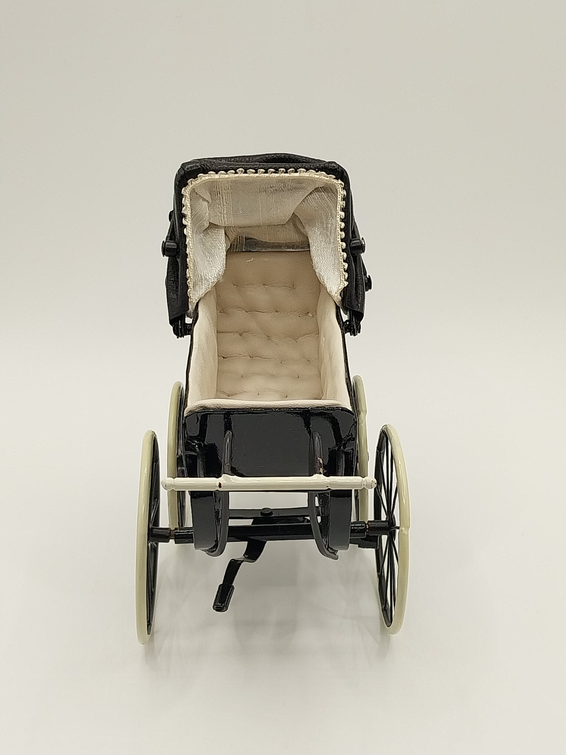 This Wilson Winston Pram is made by Artisans Colin & Yvonne Roberson. The Chassis is done in Black with Ecru trim on the wheels. The bassinet is done in black with Ecru tufted leather and a black leather canopy trimmed in ivory fabric. Piece is signed by Artisans