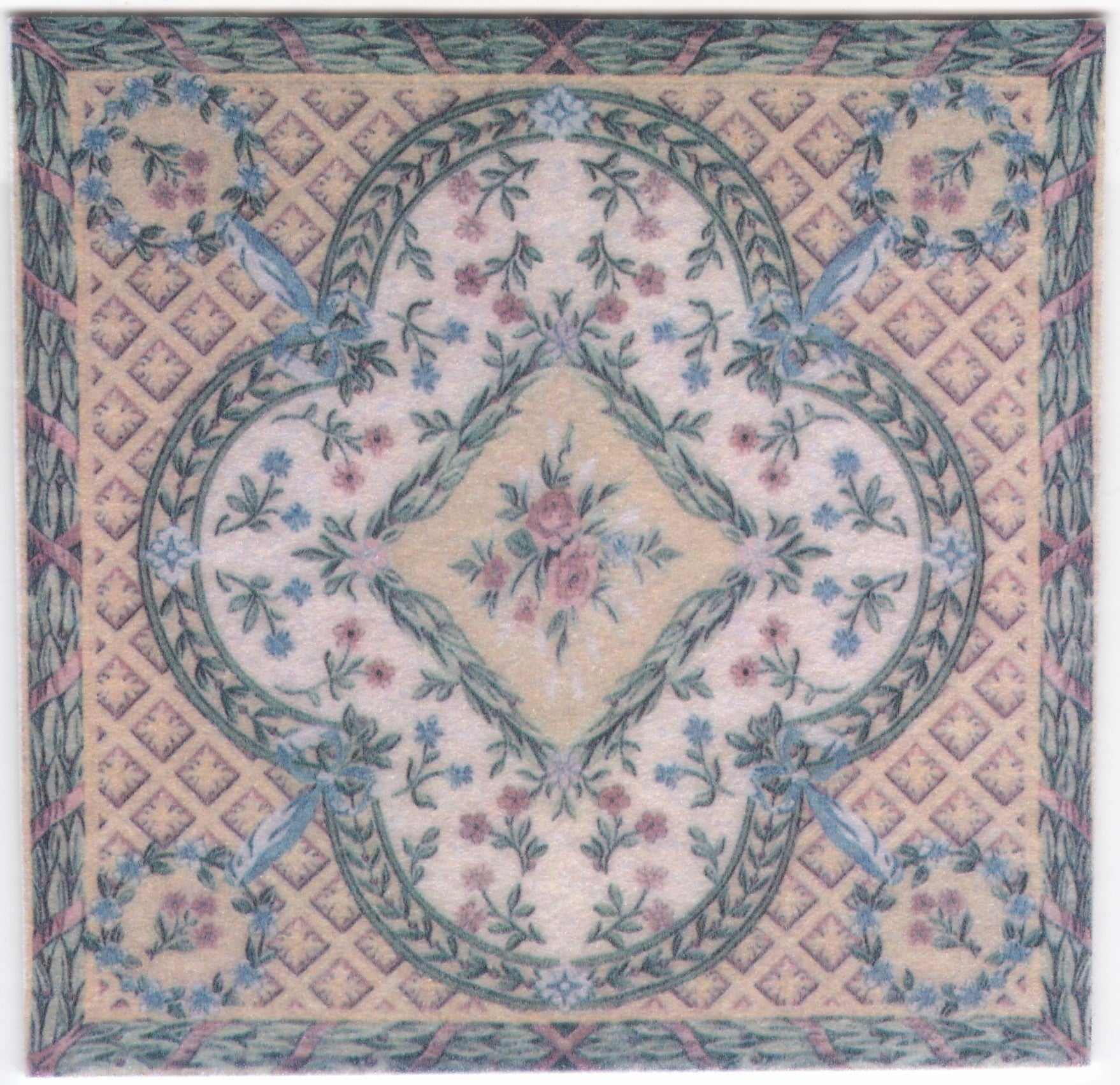 This Square Rug is a French Tapestry with Light Blue, Light Pink, Cream and Light Green Colors.