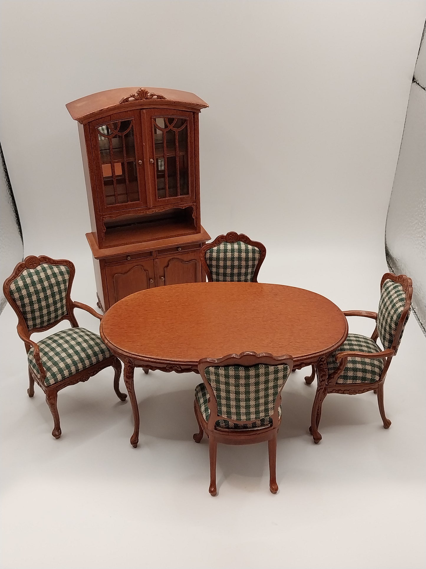 Size: Table: 5 3/8"W x 3 1/8"D x 2 1/2"H China Cabinet: 3 3/8"W x 1 1/2"D x 6 1/2"H Chair: 2 1/4"W x 1 1/2"D x 3 1/2"H