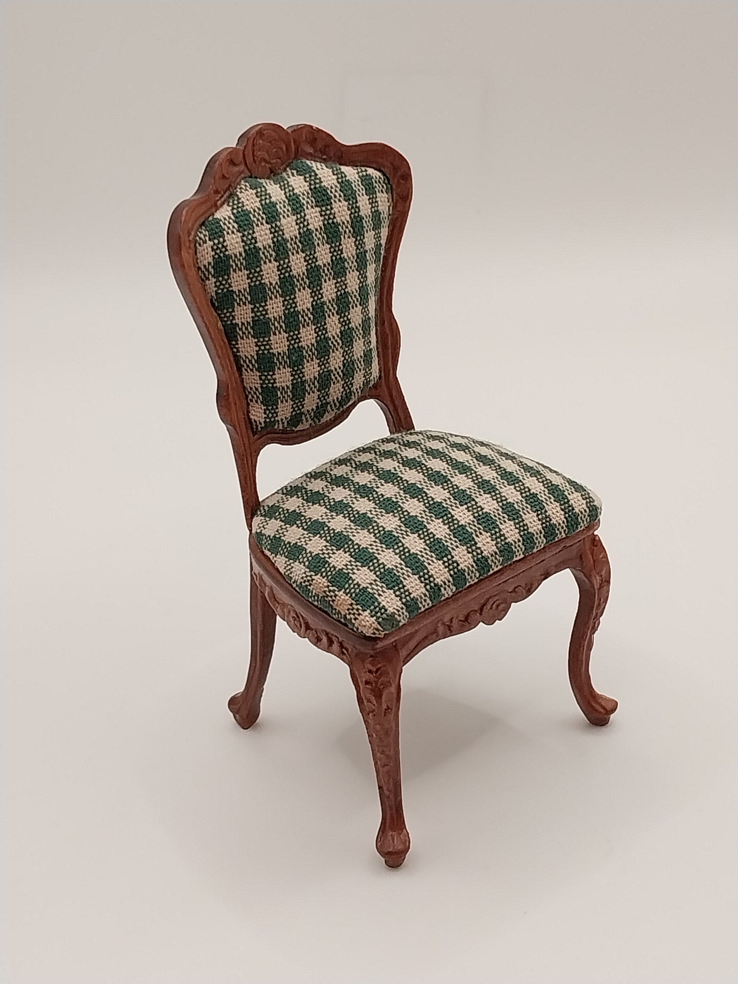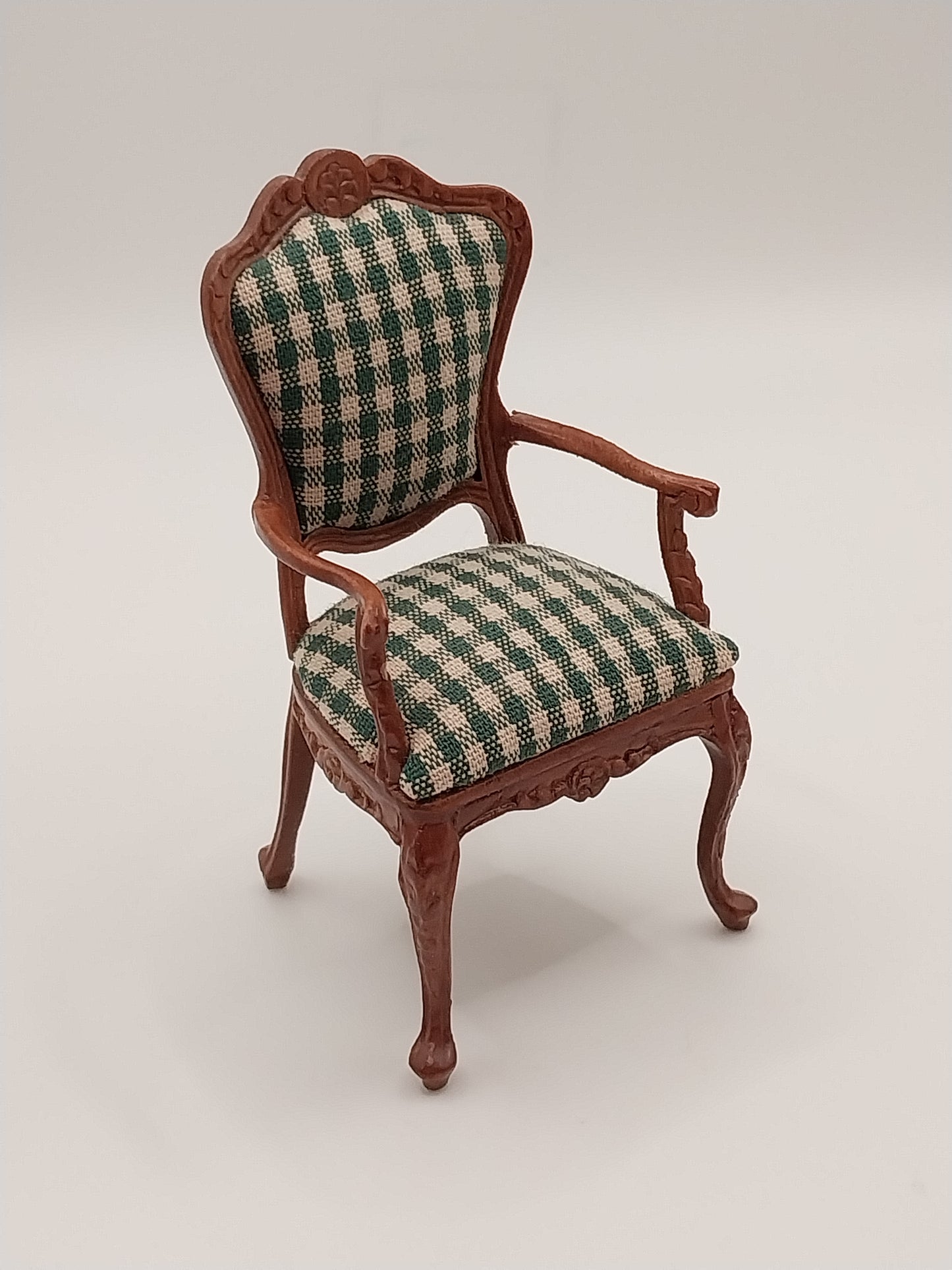 This 6 piece Printemps Provence Dining Room Set is made by Bespaq and comes in a New Walnut finish. Set includes Dining Table, 2 Arm Chairs, 2 Side Chairs,, and China Cabinet. China Cabinet has upper double glass doors with glass shelves and mirrored back. Chairs have hunter green and white plaid fabric. Each piece has intricate carved embossed wood.