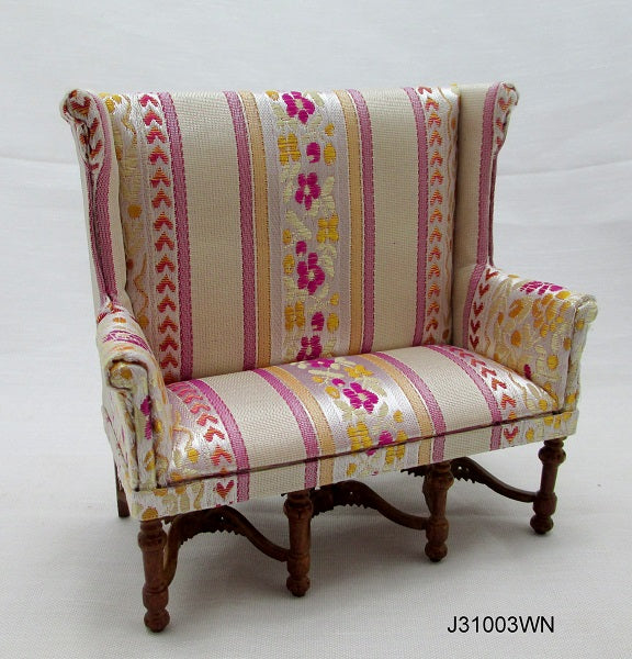 Wing back settee with wings attached to the back of the chair stretching down to the arm rest. The purpose of the "wings" is to shield the occupant of the chair from drafts, and to trap the heat from a fireplace hence, in the past these were often used near a fireplace. The settee is fully upholstered and has intertwined spreader bars and turned legs with ball feet. Comes with 3 matching pillows.