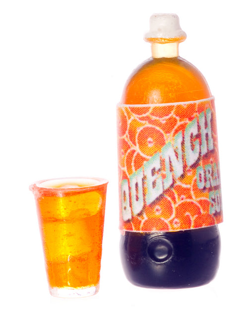 2 Liter Bottle of Quench Orange Soda with glass filled with Orange soda