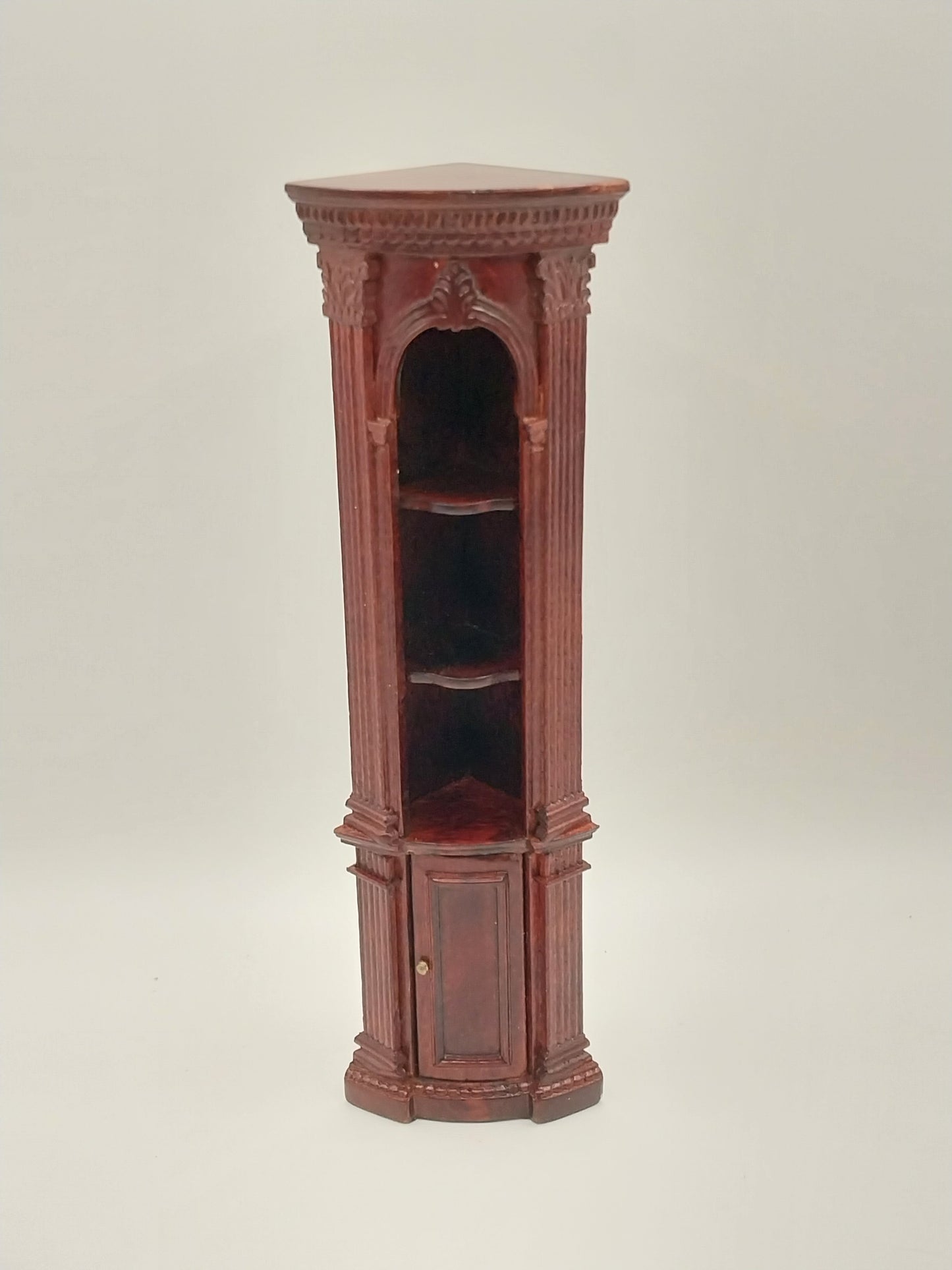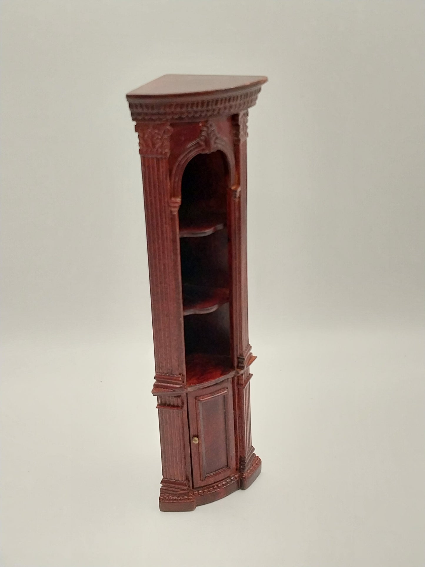 This Randall Corner Bookcase is made by Bespaq and comes in a Mahogany finish. Bookcase has intricate carved embossed wood and 3 shelves with lower cabinet door.