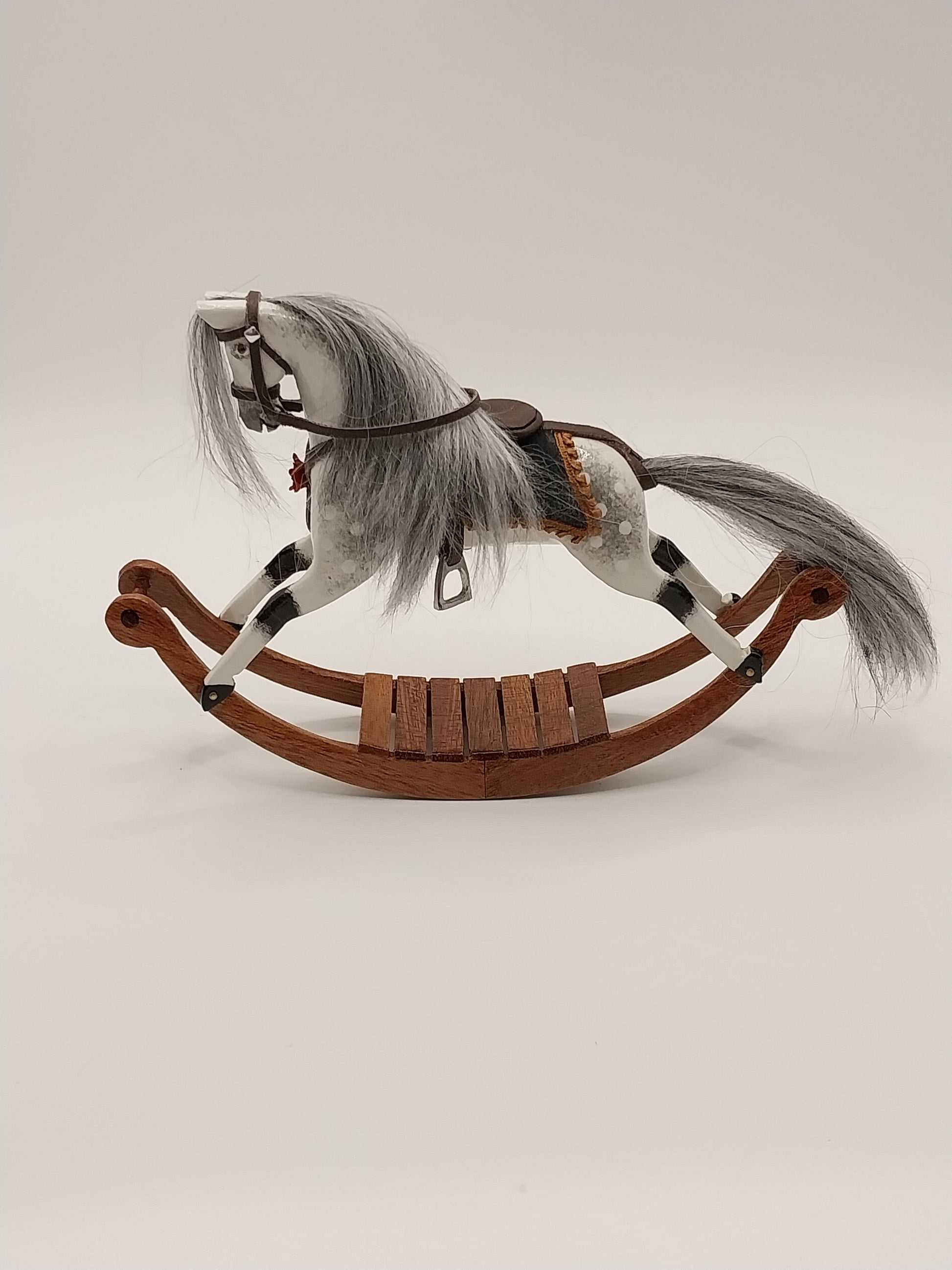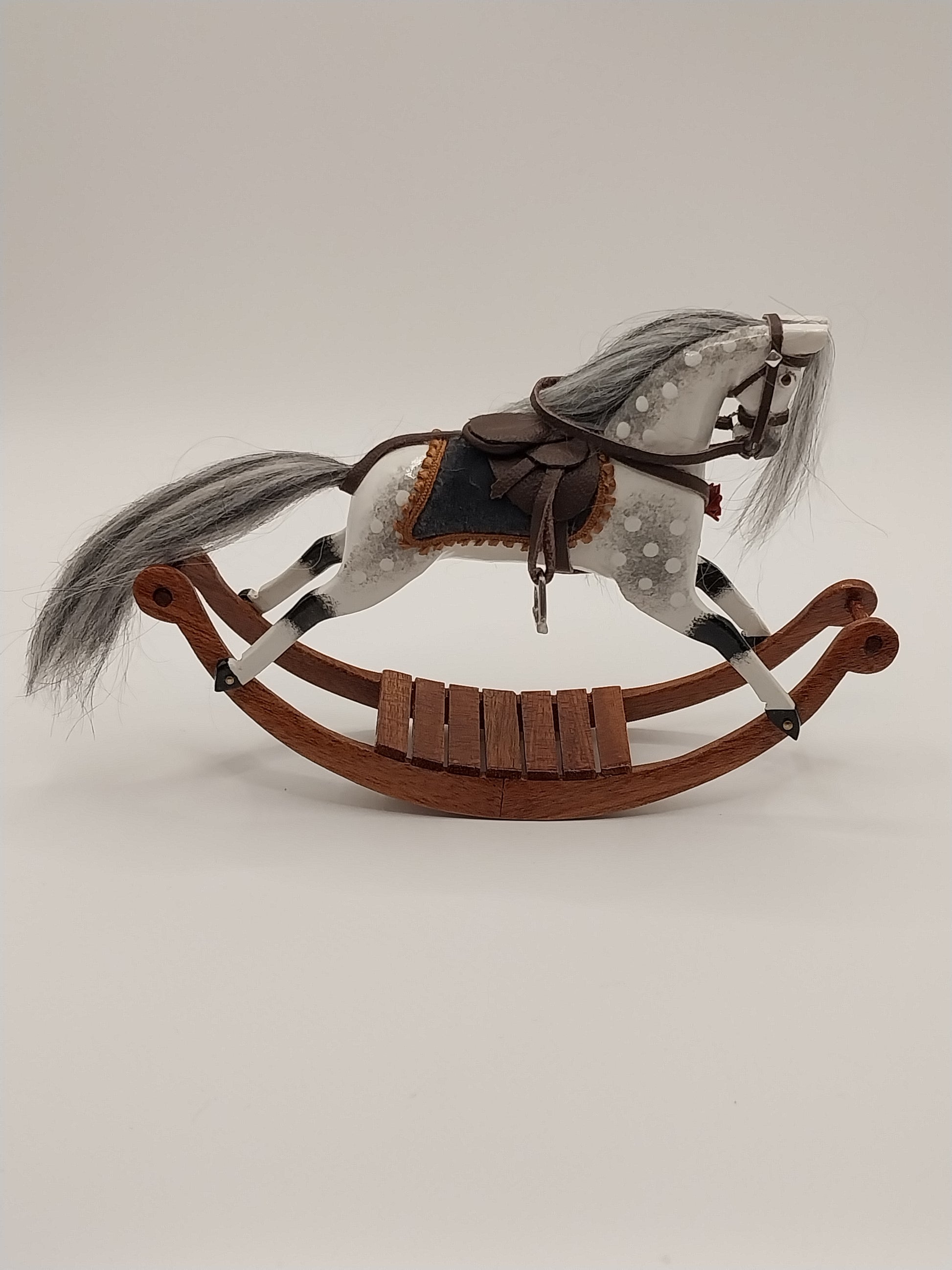 Hand Carved White and and Grey Rocking Horse with Grey mane and tail. Has blue-grey velour saddle pad with copper trim and brown leather saddle and silver stirrups. Has burgundy bow on front of saddle strap. Piece is signed ML and is made in the UK.