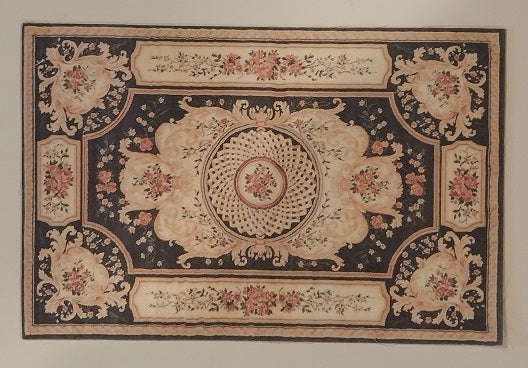 Oriental Rug in Black, Rose and Light Tan Colors with floral design.