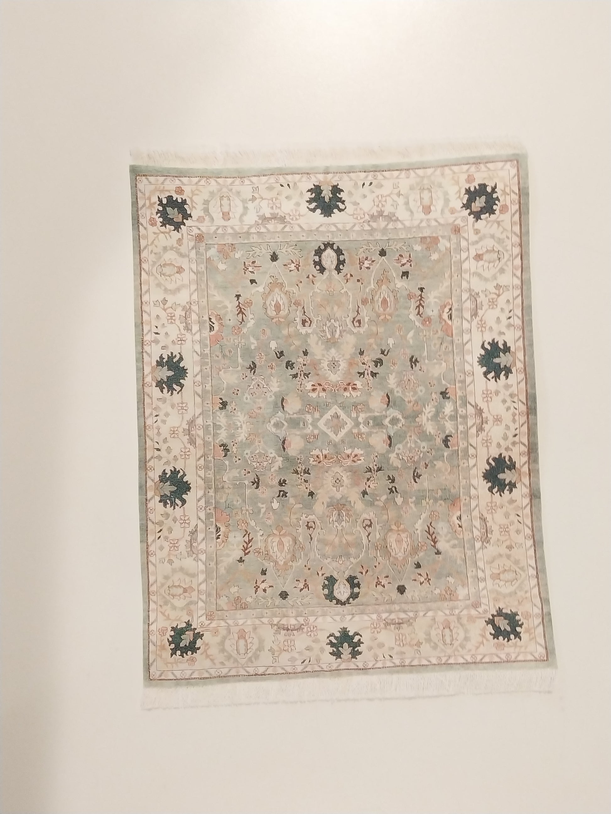 This Rug is done in Seafoam, Green, Cream, and Peach Colors