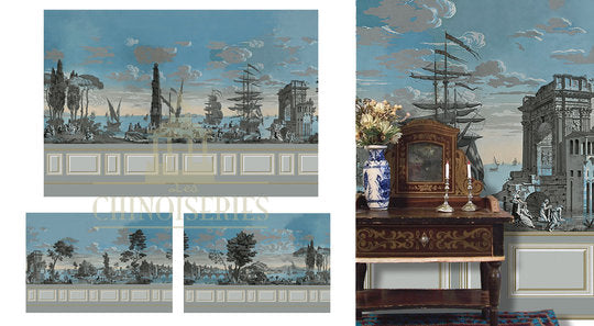 Wallpapers with a continuous landscape: theatrical elegance to enrich your miniatures. These long murals tell stories and paint portraits of exotic places with a special expressive grip. They have personality and their perspectives enlarge the room.