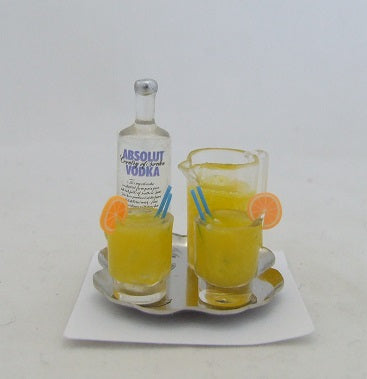 This Screwdriver Set up includes a bottle of Absolute Vodka a pitcher filled and 2 glasses filled with a screwdriver and straw with a orange garnish.