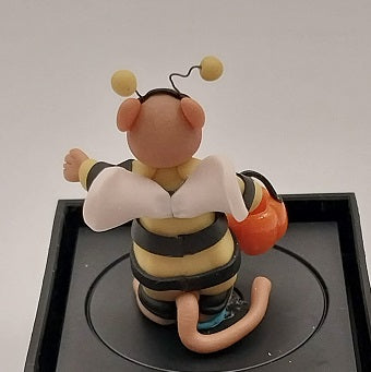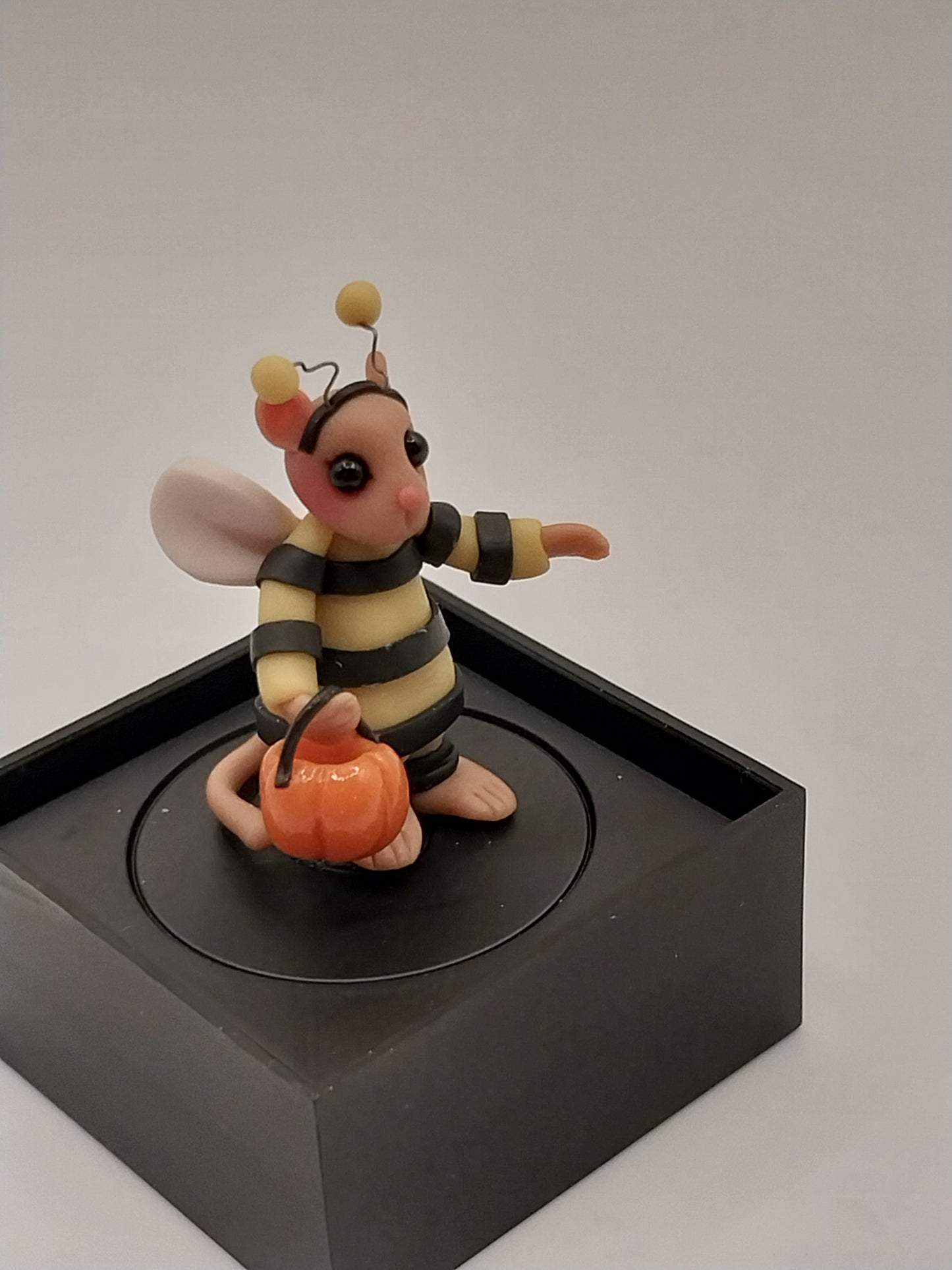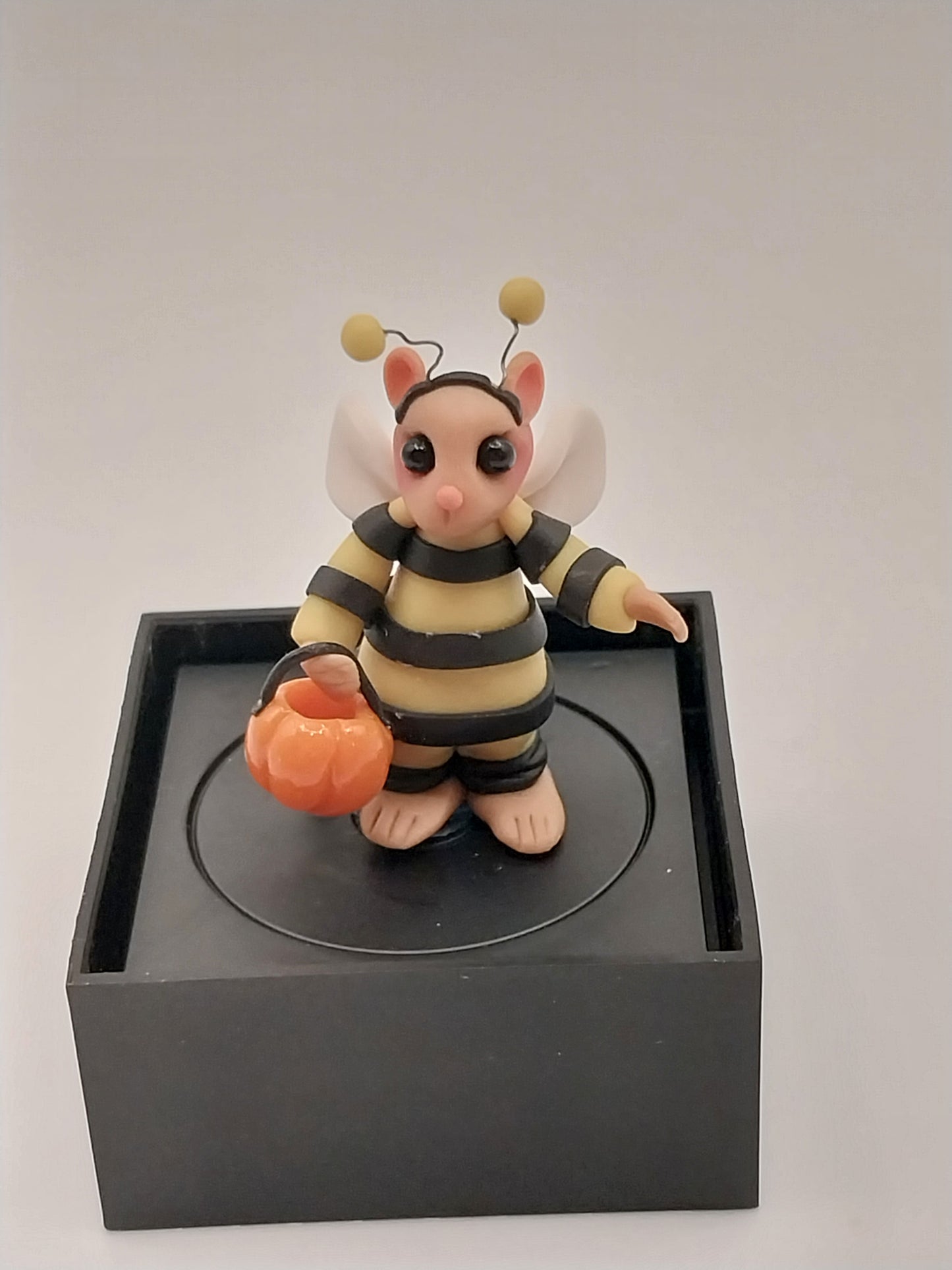 Hand Sculpted Mouse dressed as a Bumblebee holding a pumpkin candy pail, done by Artisan Patricia Smith of Nip and Tuck.