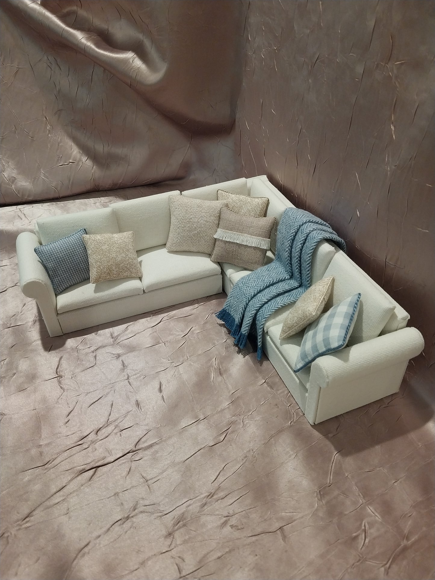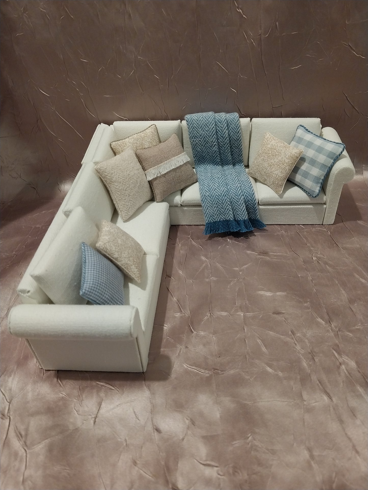 Sectional Living Room Set Cream with Blue & Tans Throw & Pillows