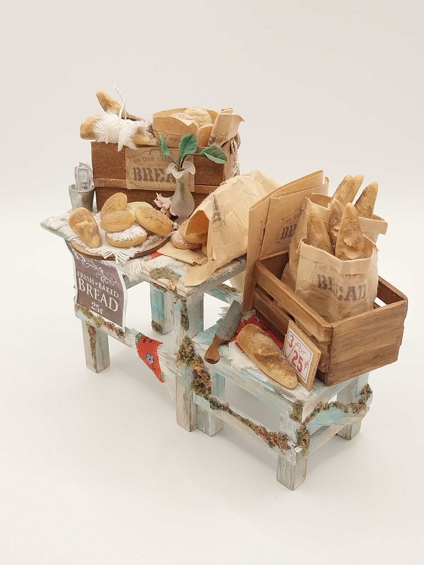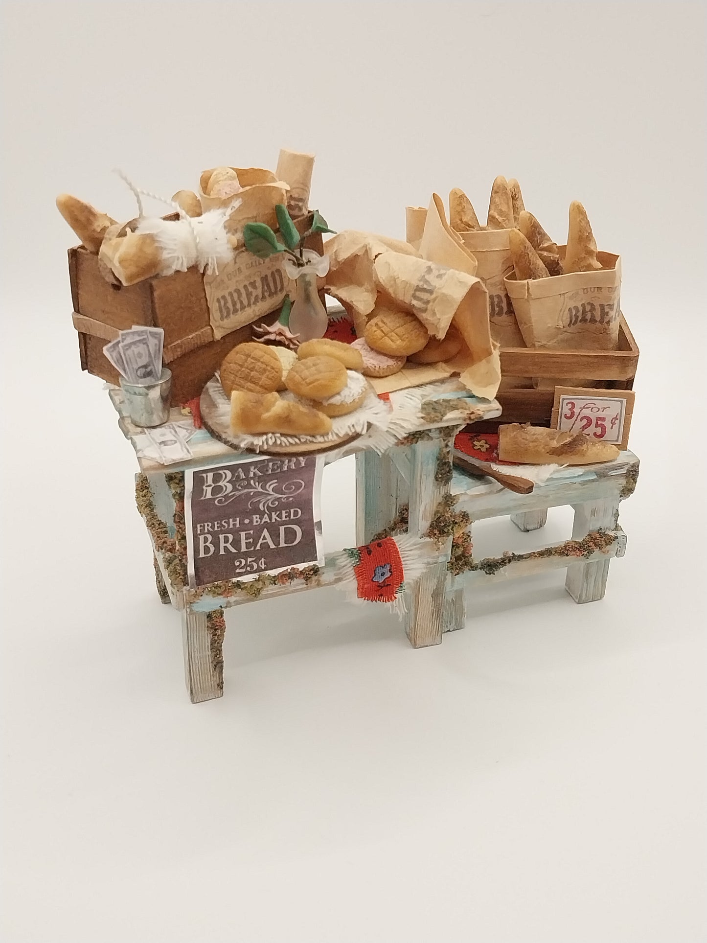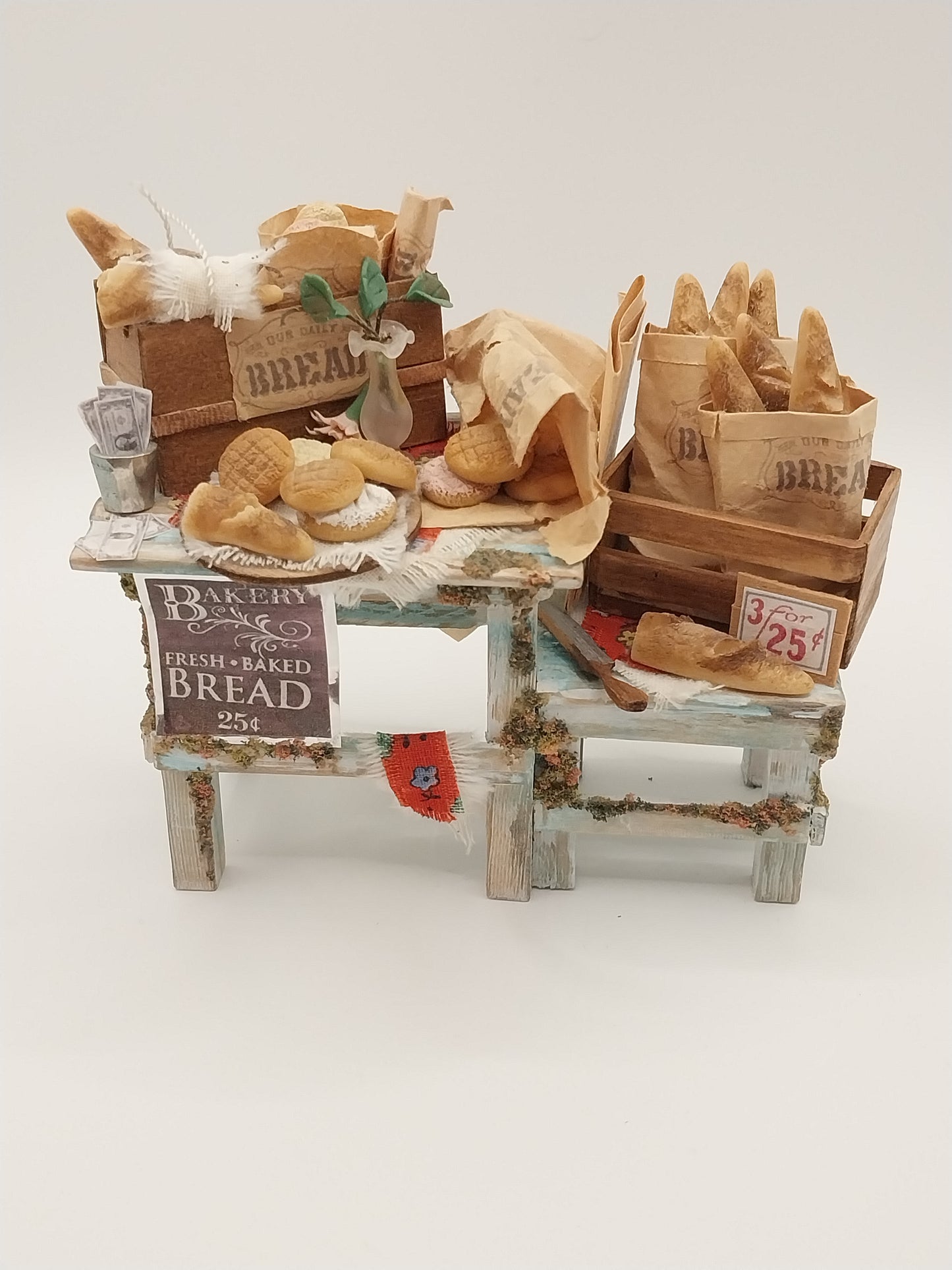 Faux painted wooden table in sea foam green with a Variety of different breads for sale. Table is decorated with flowers vines and all the essentials you need to sell bread such as a money pail, knife, baking towels and of course a few signs of the Fresh Baked Bread you are selling.
