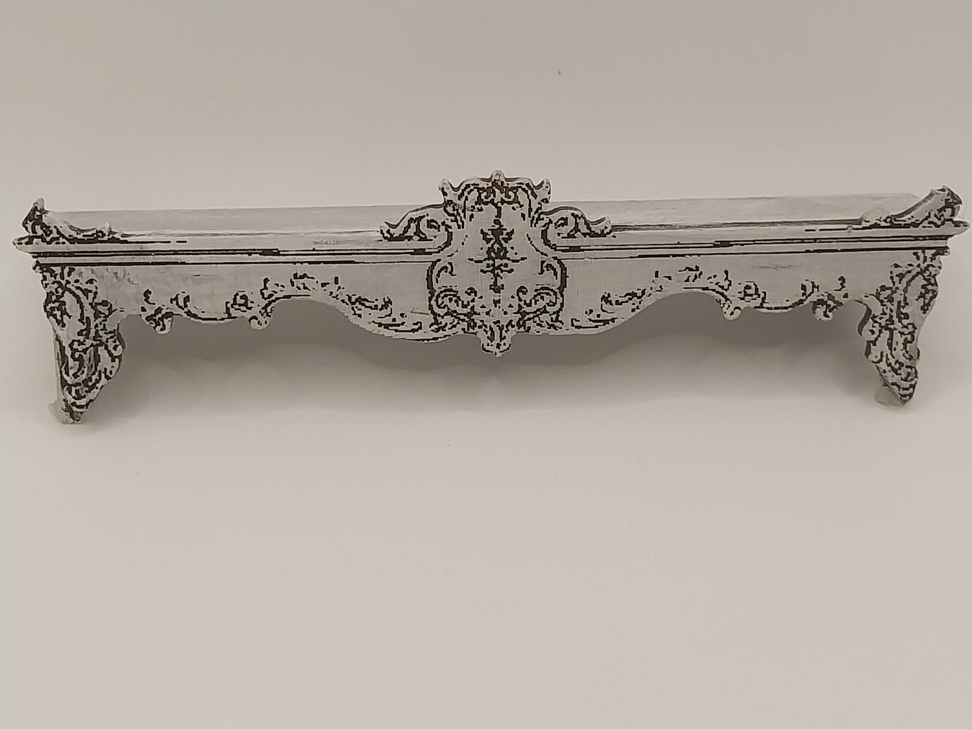 Shabby Chic Gray Window Cornice with fancy etched wood