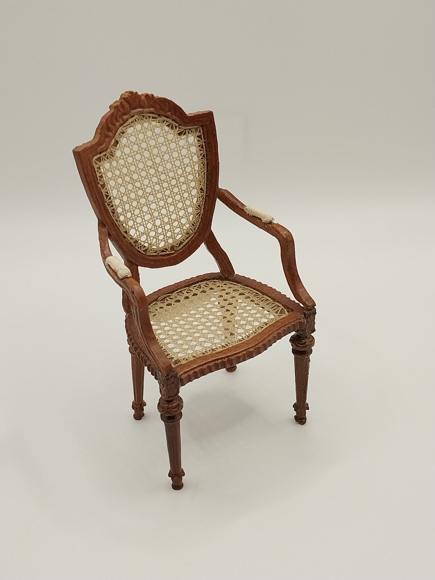 This Sheild Back Chair is made by Bespaq and comes in a Walnut finish. Chair has hand caned back and seat with cream fabric on arms. Beautifully made.