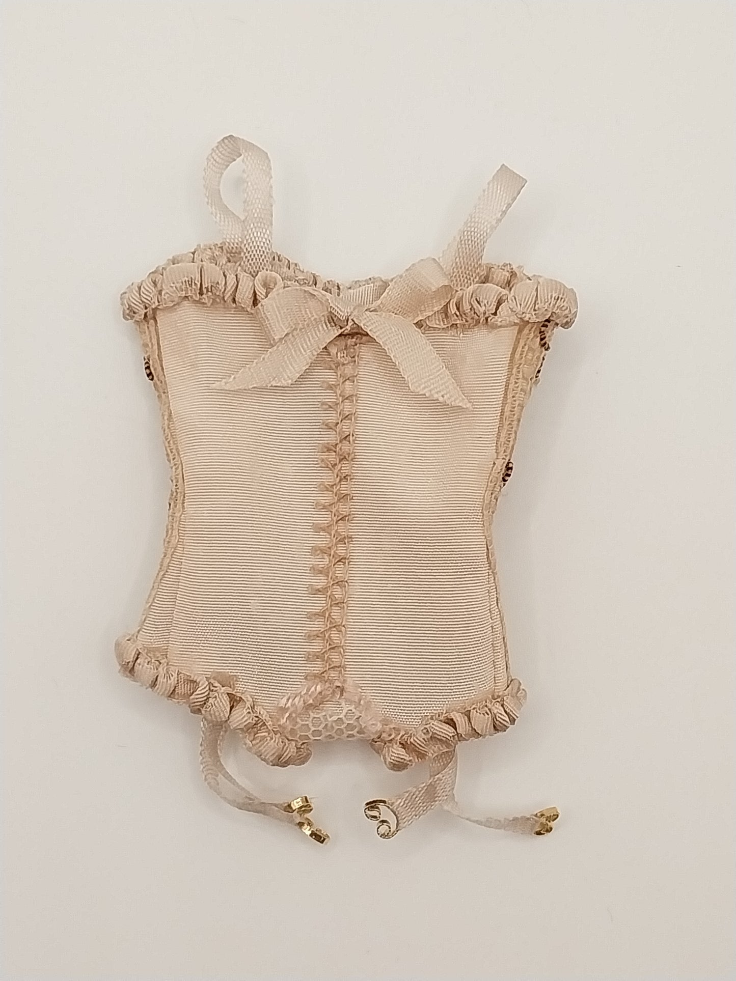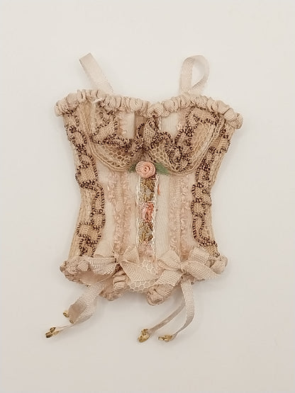 Silk Tan Corset with tan lace and pink silk rose.
