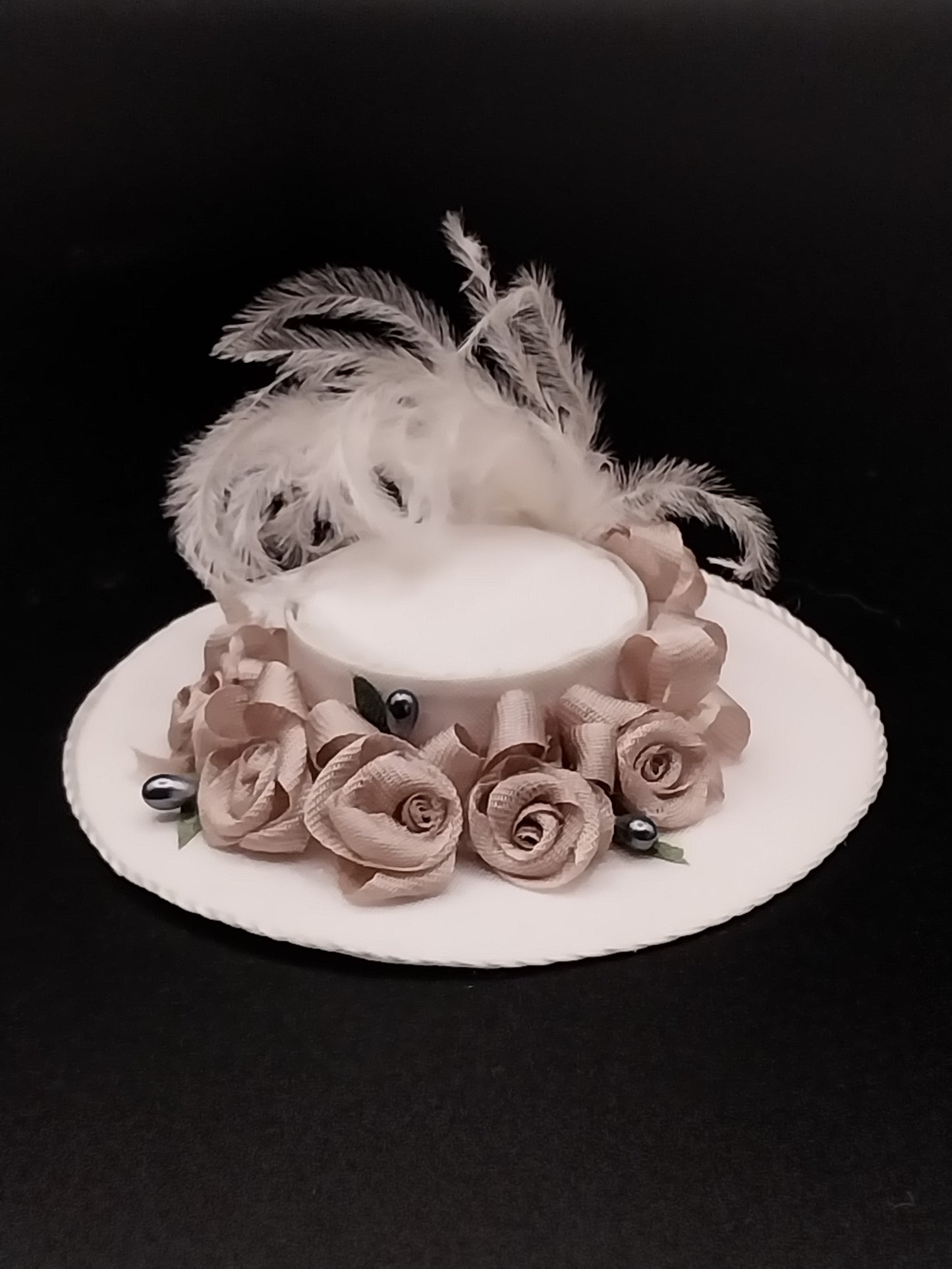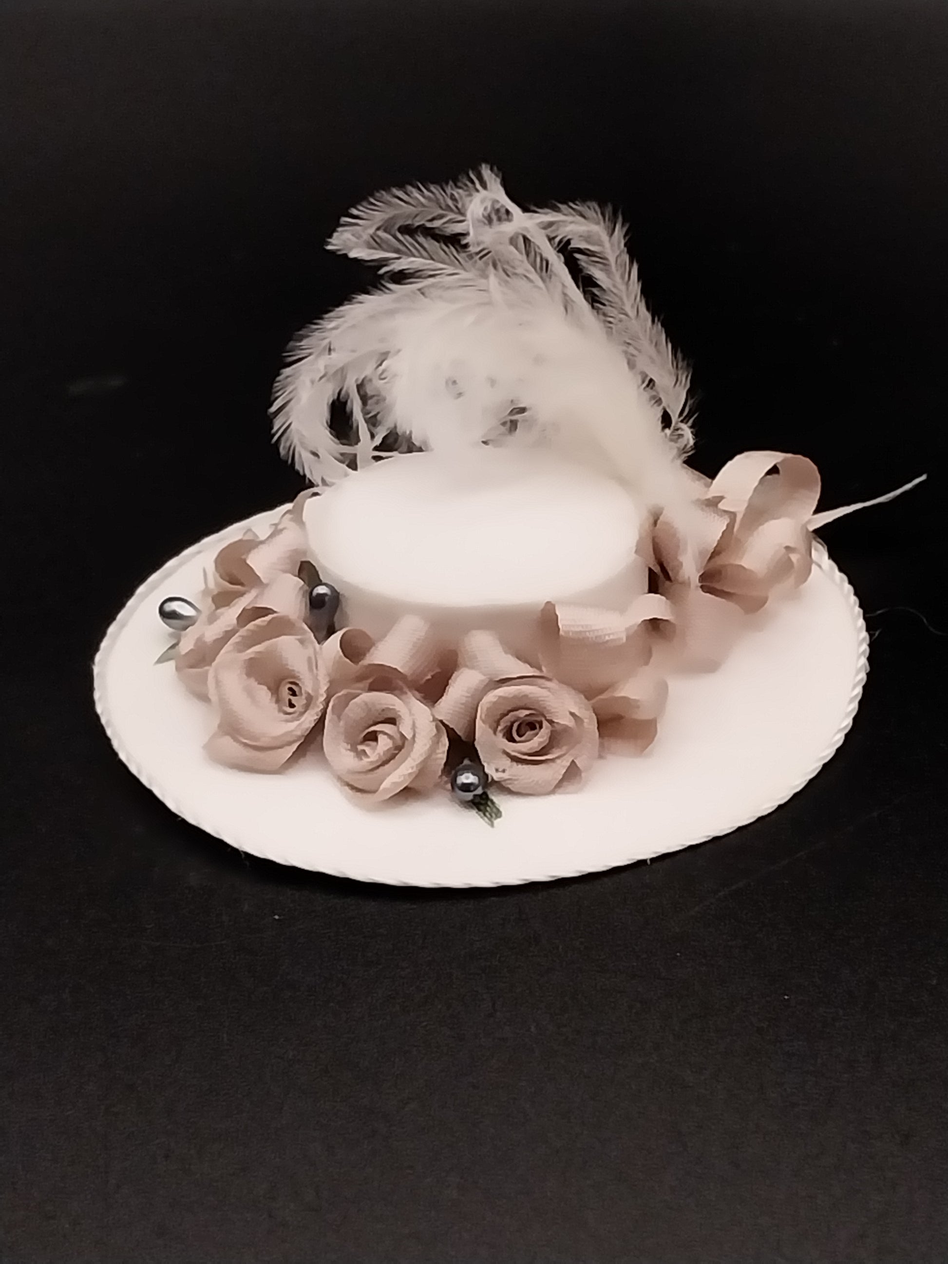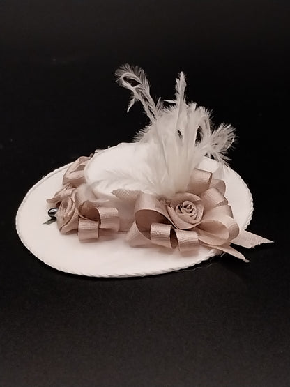 Victorian Ladies Silk Hat in an Ivory color with a pale lavender silk bow and silk roses with green beads and tiny leaves with white feather.
