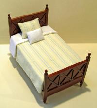 Our wood single bed is finished in a spice stain and embellished with an elegant “X” design on the headboard and foot board. This is a timeless design that would fit into any style of bedroom, from traditional to contemporary. It is small enough to fit into most any dollhouse room, even the third floor with the slanted ceiling. The bed includes a mattress covered in white fabric. Bed Comforter and pillow case not included