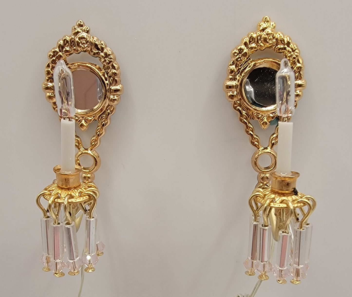 Mirrored Wall Sconce with pink crystals with single candle. Gold mirrored backing. The bi-pin bulbs are replaceable bulbs, and works with a 12 Volt Electrical System