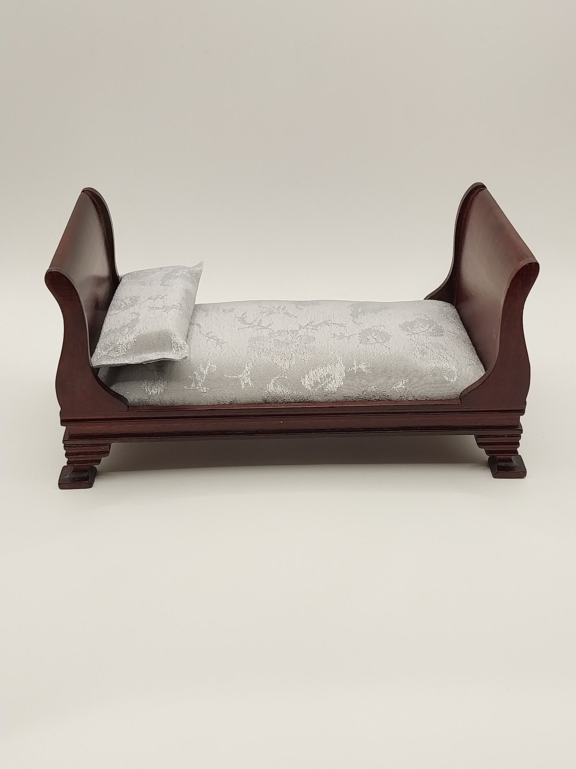 Single Sleigh Bed in a Mahogany finish. Bed has a gray silver fabric, which can be changed to match your decor.