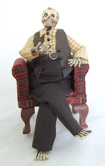 This Skeleton Man is sitting in a Chair with his legs crossed enjoying his cigar. He is wearing a mustard yellow and cream plaid shirt with black buttons and a faux leather vest and matching belt with brown slacks. He still has a little bit of his brown hair.