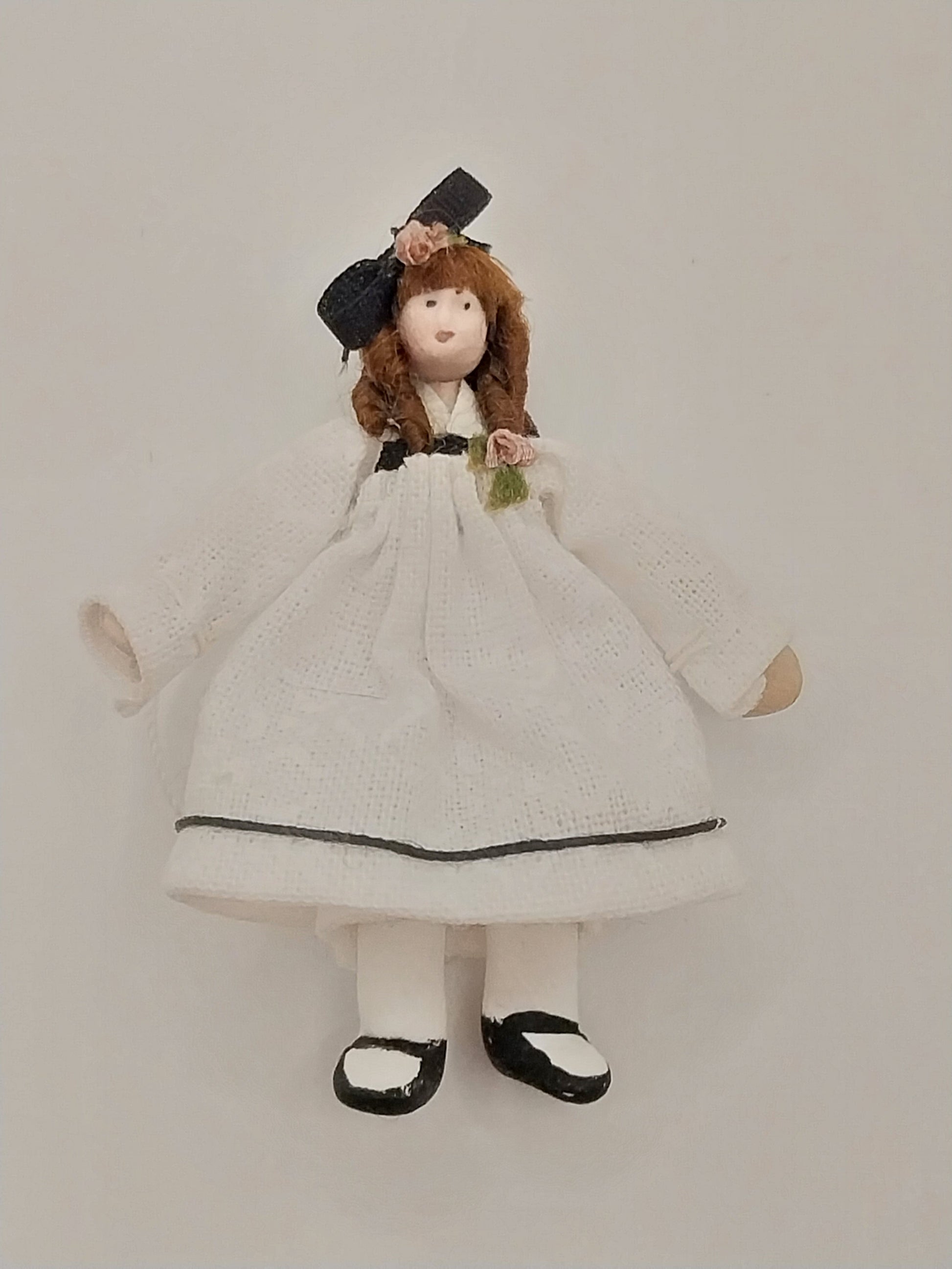 This Small Baby Doll is wearing a white dress with black bow in her brown ringlet hair. Has a small pink rose at collar of her dress on on black hair bow. She has black and white shoes. Doll is poseable