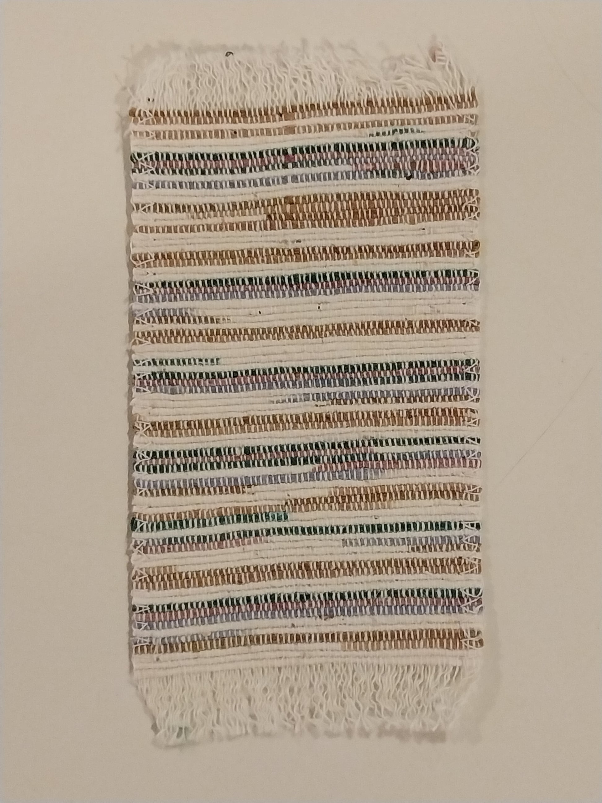 Small rag rug stripes with cream, lavender, tan & green stripes.