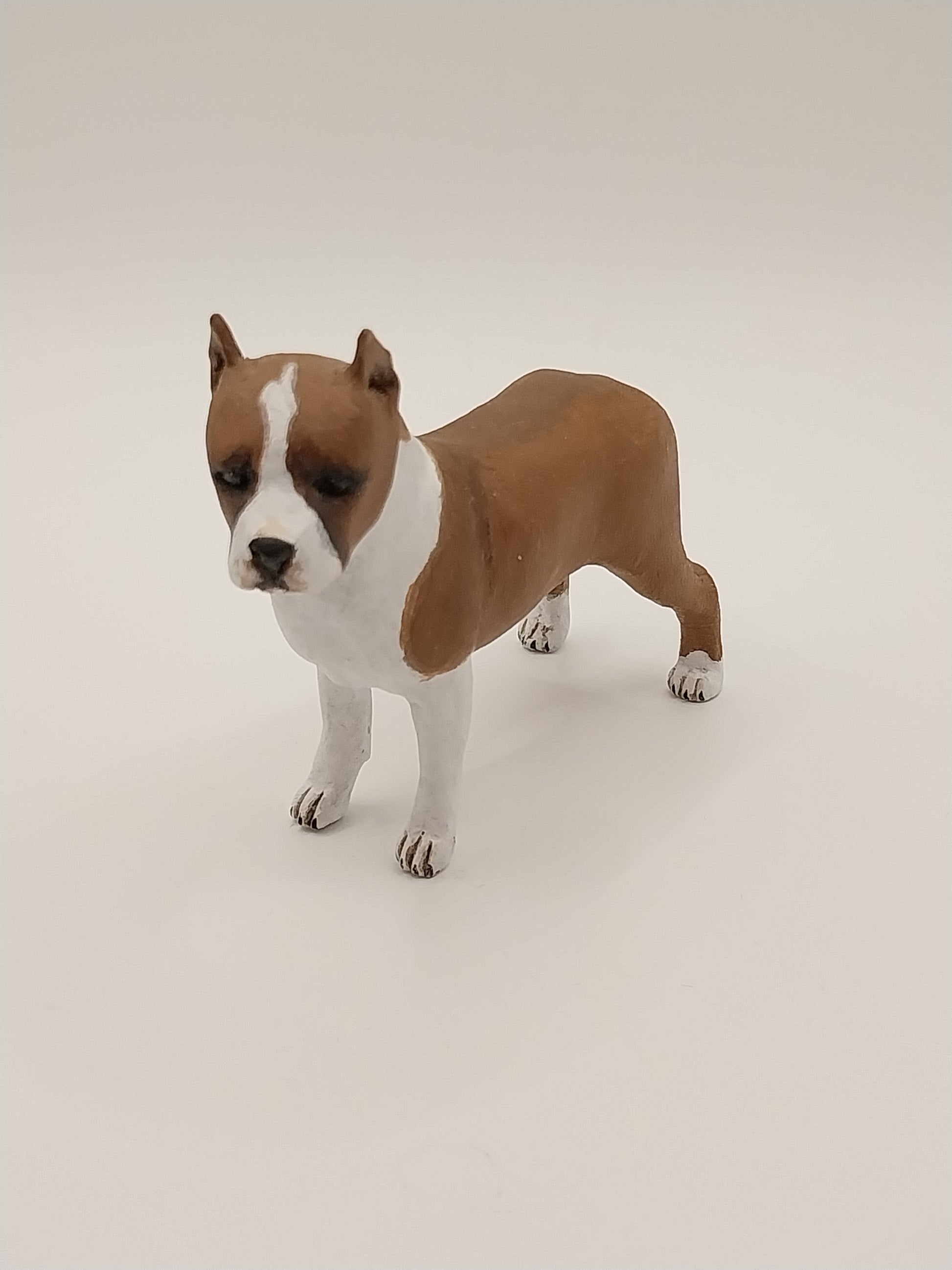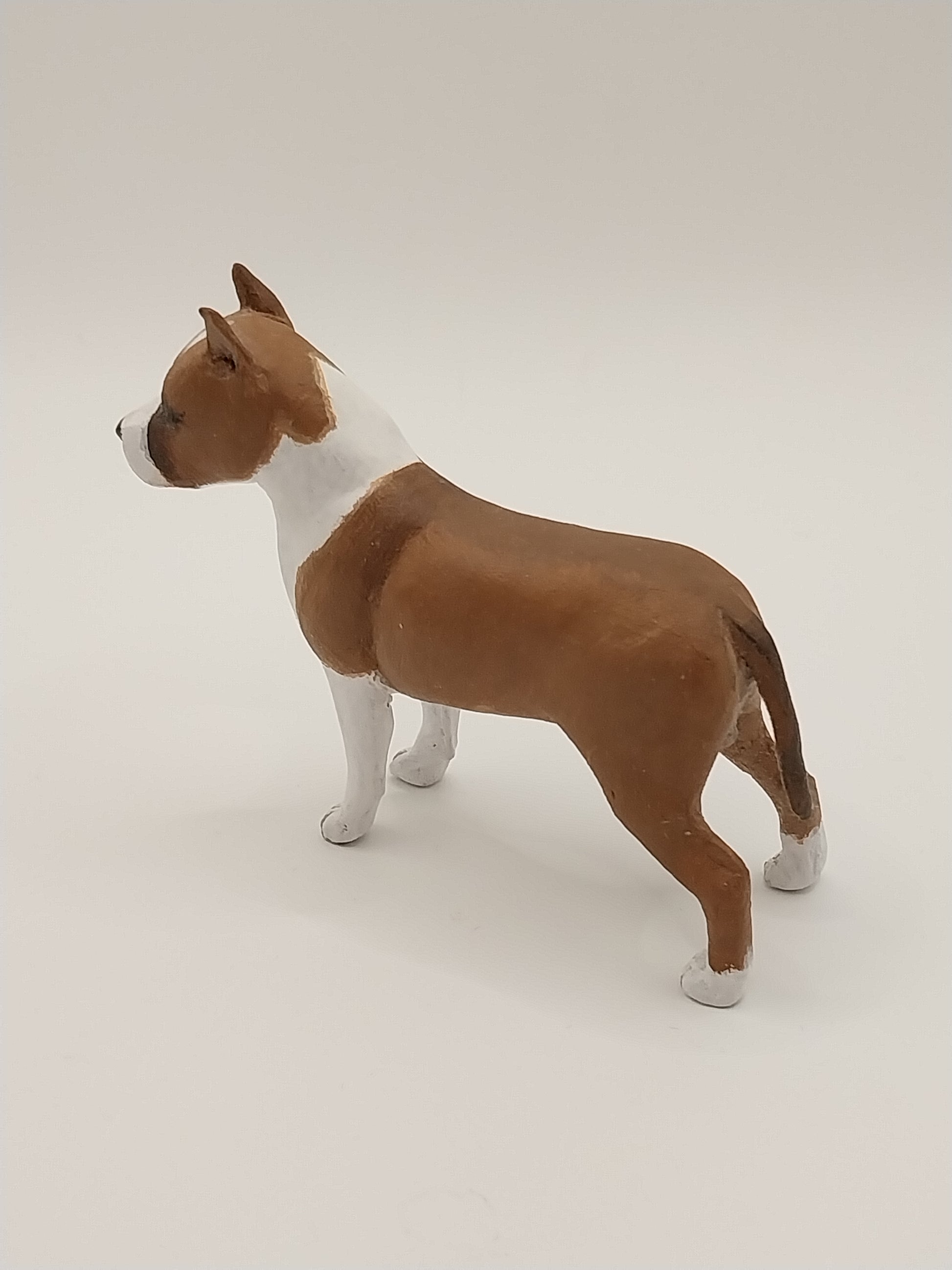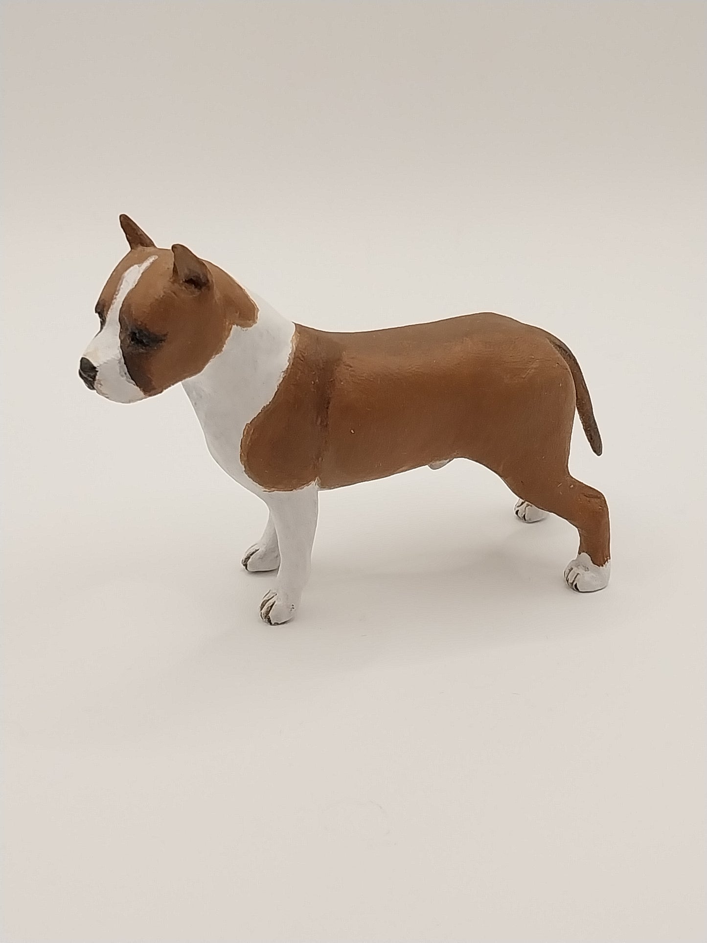 Staffordshire Brown and White Terrier Dog in a standing position. Dog is hand painted and sculpted by Artisan Karl Blindheim.