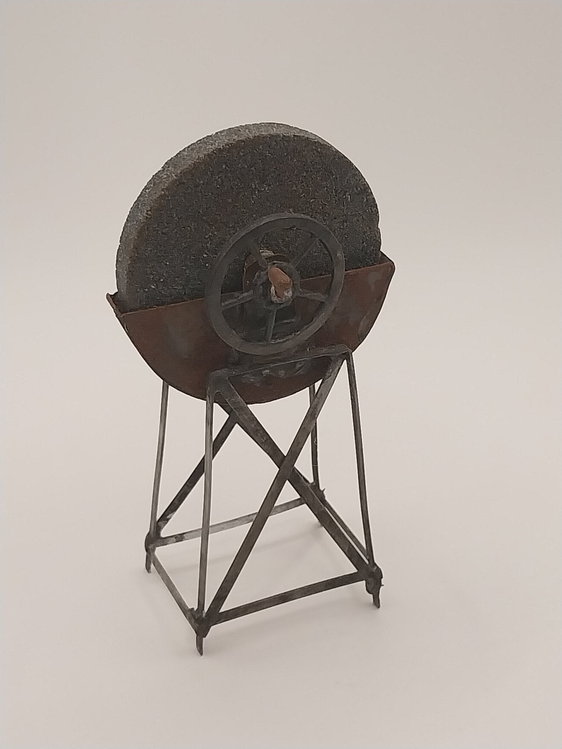 This Standing Grinding Wheel is handmade by Artisan Fred Cobbs. Piece is made of soldered metal and copper. Wheel actually turns. Piece is signed by Artisan.