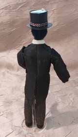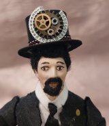Porcelain Steampunk Man Doll made by Artisan Patsy Thomas. He is wearing a White dress shirt, black and gold stripe pants with black shoes. He has a red and gold vest with black suit jacket and black tie. He has black hair with matching black mustache and goatee as well as a black steampunk hat and is holding a cane. Doll Stand is included