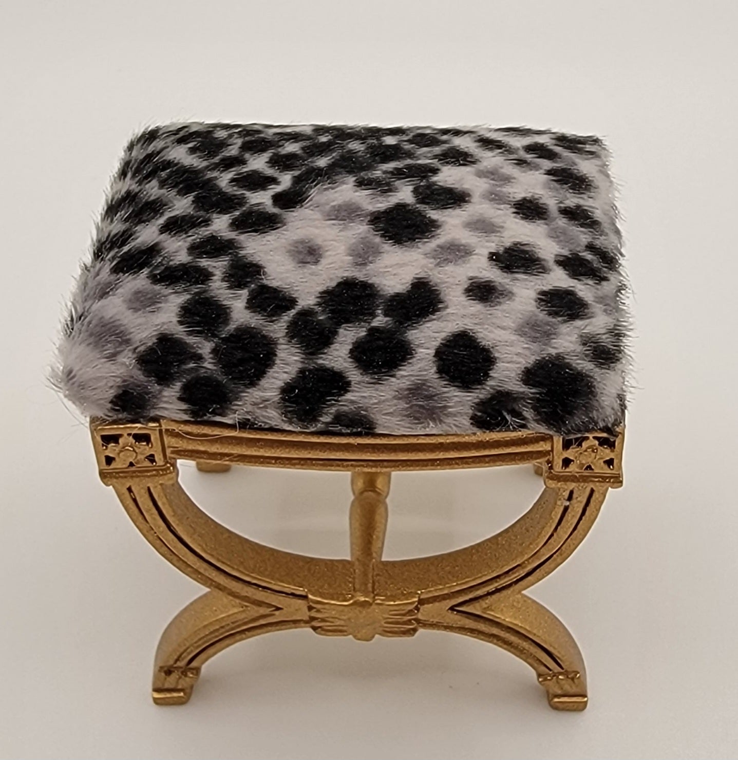 The stool measures 1 1/2 inches high x 1 5/8 inches wide x 1 1/4 inches deep and has been painted gold. It is upholstered in a black, gray, & white faux fur fabric.
