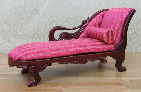 This Swan Chaise is made by Bespaq and comes in a Mahogany finish. Chaise has a red stripe silk fabric and roll pillow to match.