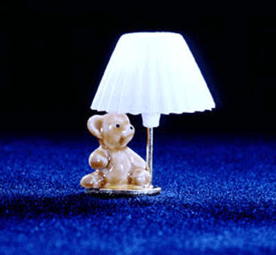 This table lamp has a teddy bear on the base with a white shade. Replaceable screw in bulb, and works with a 12 Volt Electrical System
