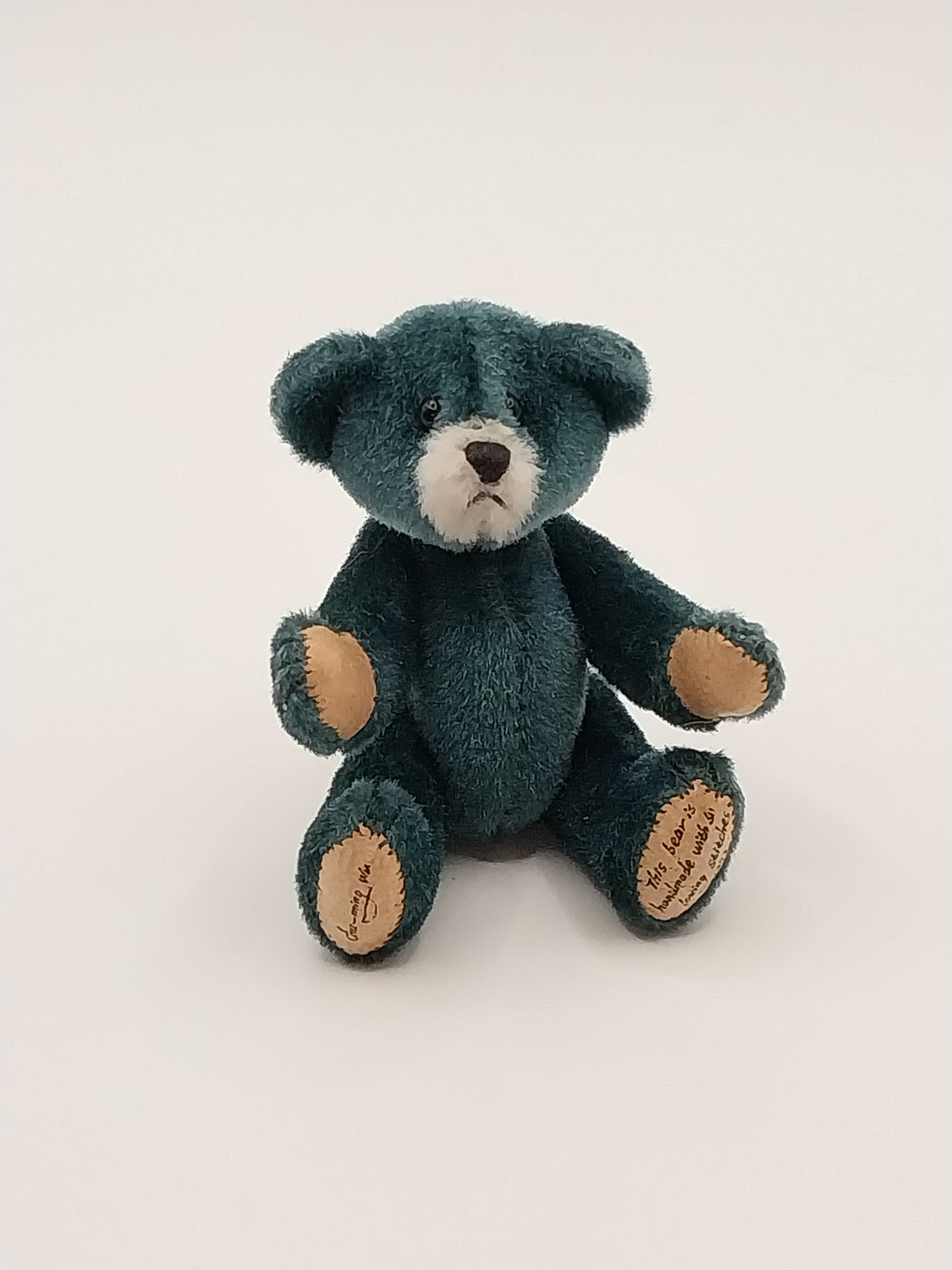 This Spruce Green Teddy Bear is handmade with leather pads on hands and feet. Teddy Bear has jointed hands and feet, that are signed and dated.
