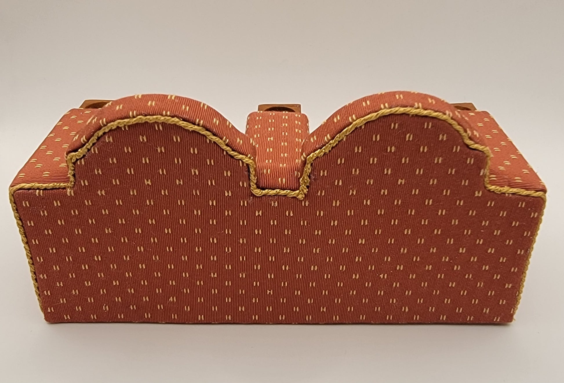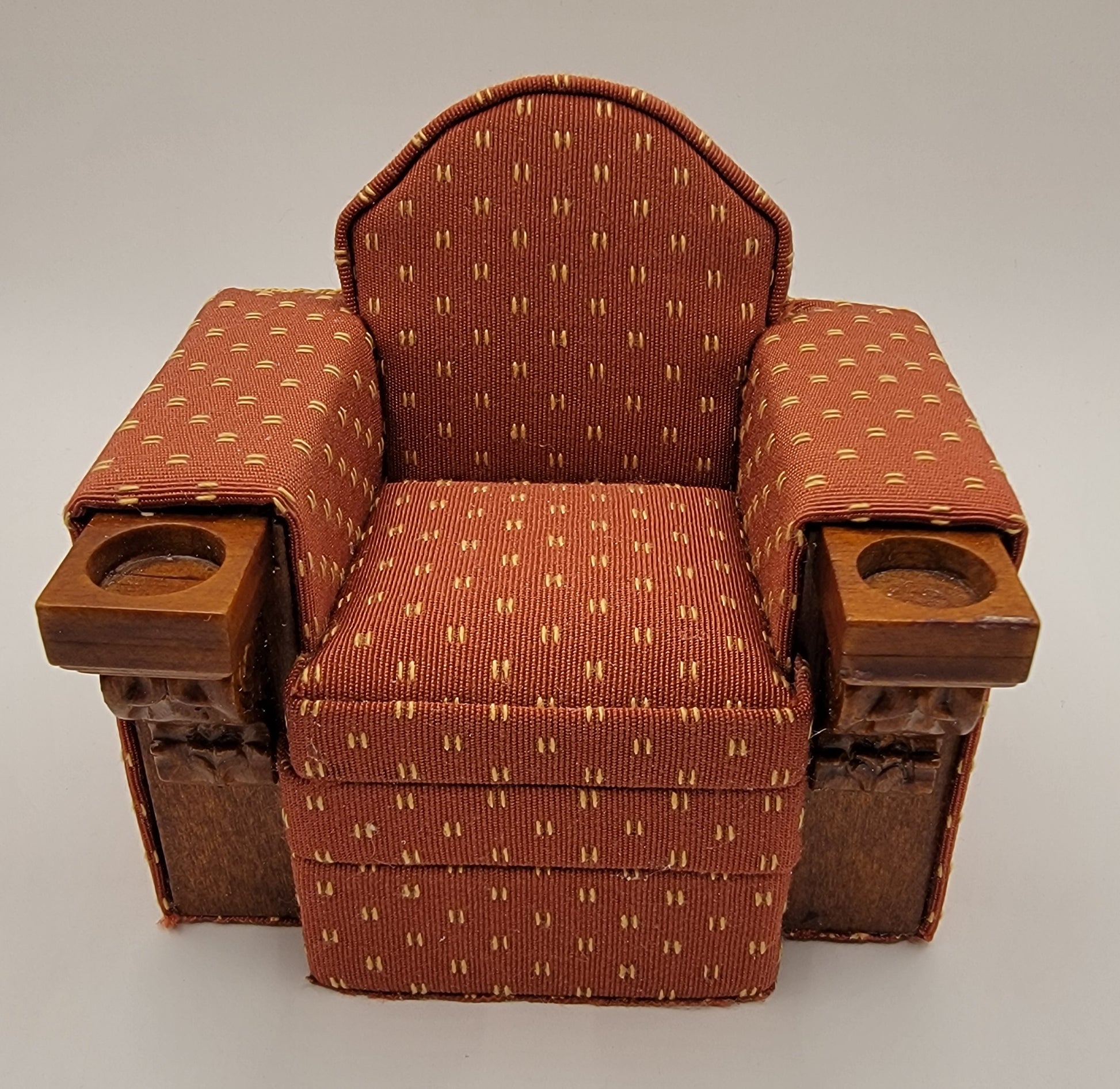 Theater style double and single seating chairs in an upholstered brick red with yellow geometric pattern with cup holders. This piece is part of the Platinum Collection Series. The wood has corbel carving on the wood and the stain is a special walnut color. The upholstery was done by Wilson Santiago. This is a one-of-a-kind custom set.
