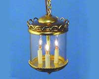 Brass hanging fixture. Flame tipped bulbs enclosed in a glass cylinder. Matches sconce LB608, 12 Volt. Non Replaceable Bulb