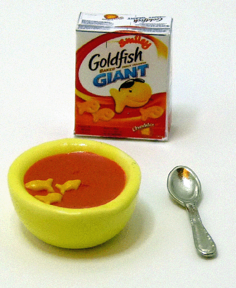 Great for a snowy day! Tomato soup in a bowl with gold fish crackers, spoon