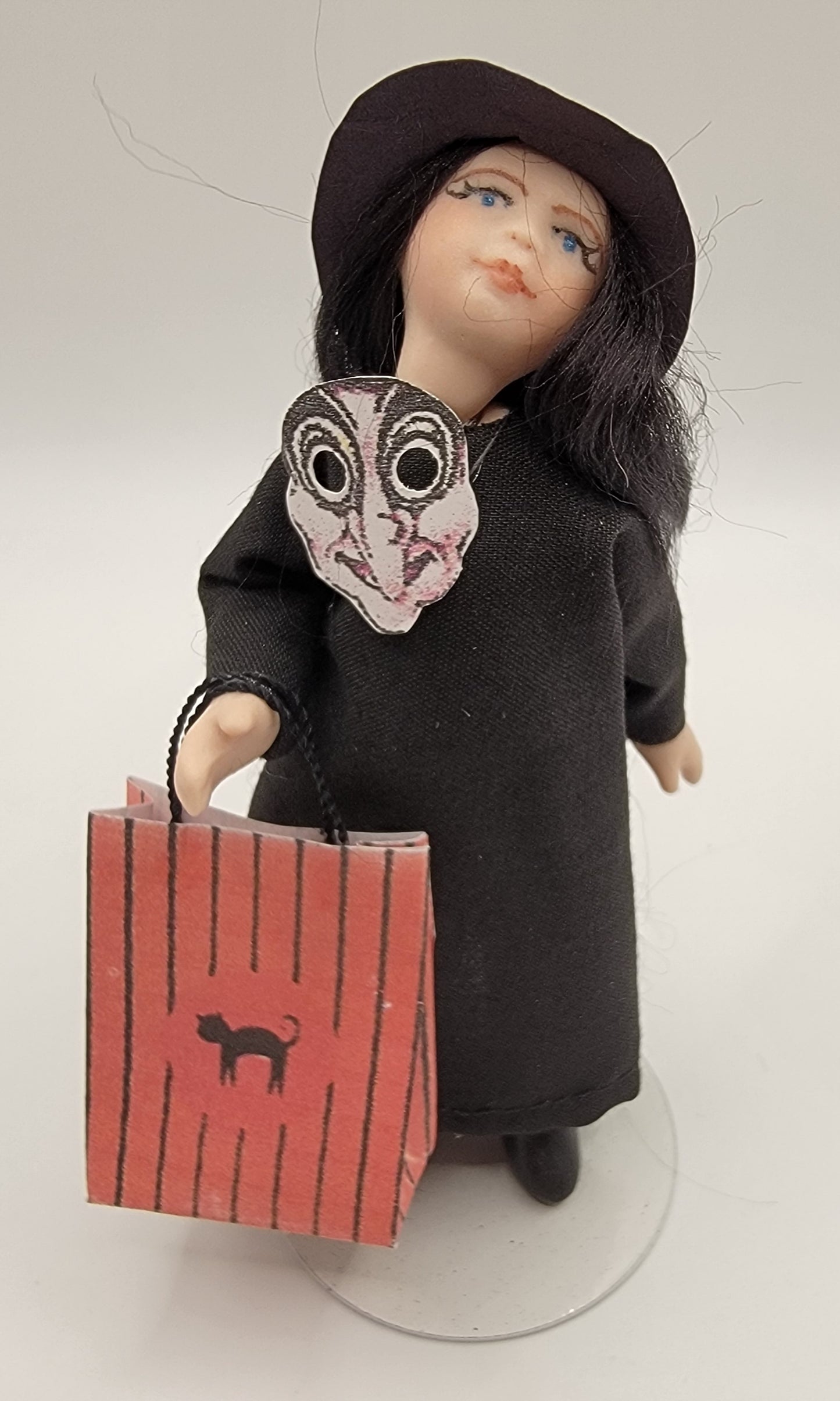 Little girl dress as a witch for trick or treat. She is made of porcelain and fully pose-able.
